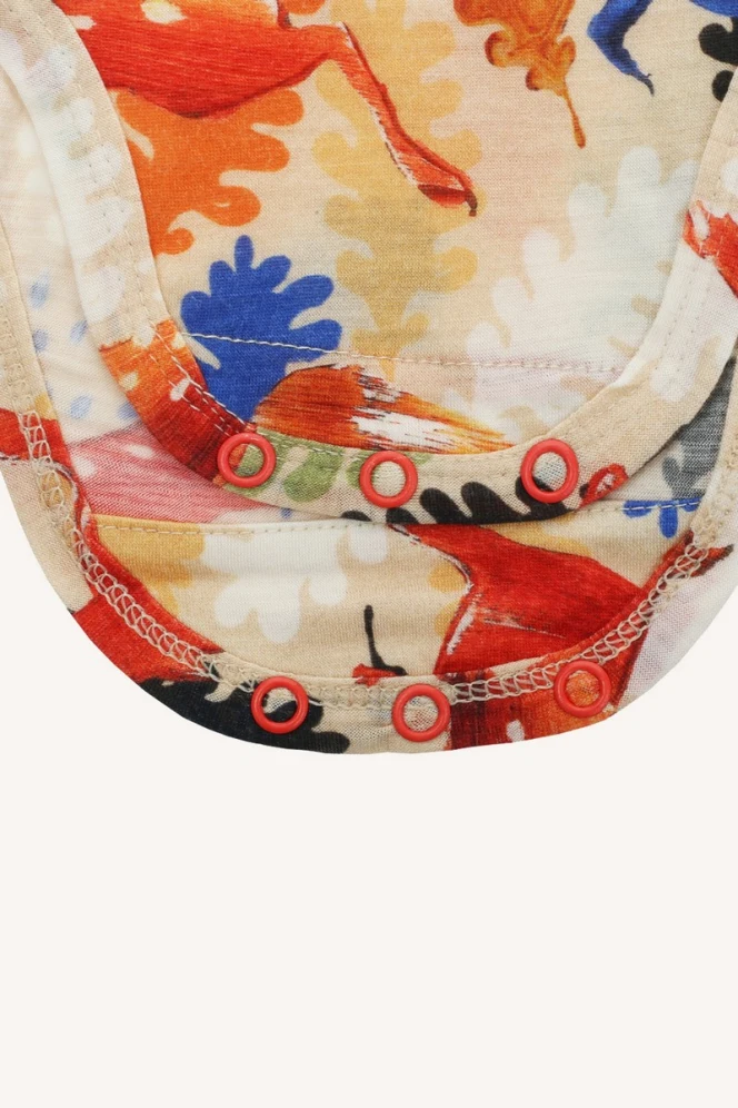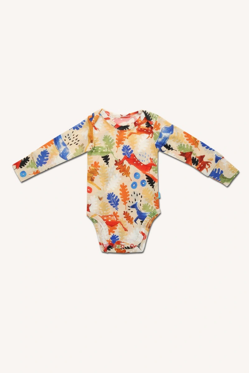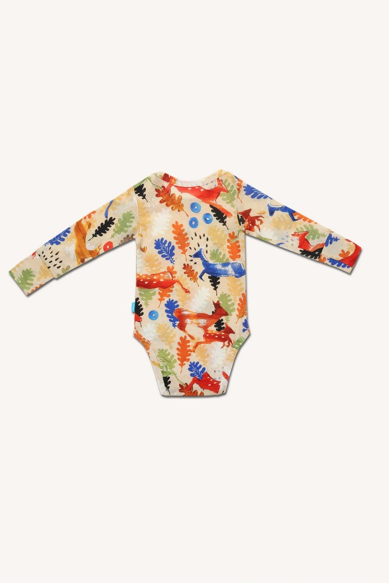 Dětské body z 100 % merino vlny s ručně malovaným vzorem woods inspirovaným přírodou a lesem. Funkční, prodyšné a měkké – ideální pro celoroční nošení. Merino vlna přirozeně dýchá, odvádí vlhkost a udržuje dítě v suchu i teple.