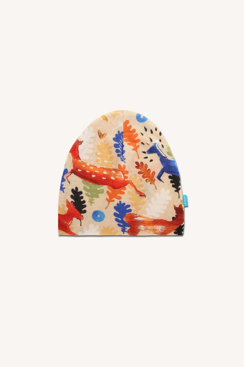 Tenká dětská čepice z dvojité vrstvy jemného úpletu z merino vlny ve vzoru woods. Oblíbí si ji každý malý milovník barev a zvířat.