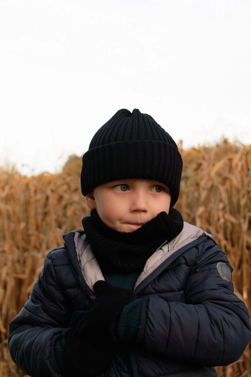 Klasická černá dětská čepice z jemné merino vlny. Měkká, hřejivá a univerzální – sedí ke každému outfitu.