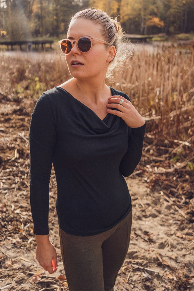 Jemná, měkká a příjemná na dotek, a přitom vysoce funkční – tato černá merino halenka spojuje pohodlí termoprádla s elegancí klasického šatníku.