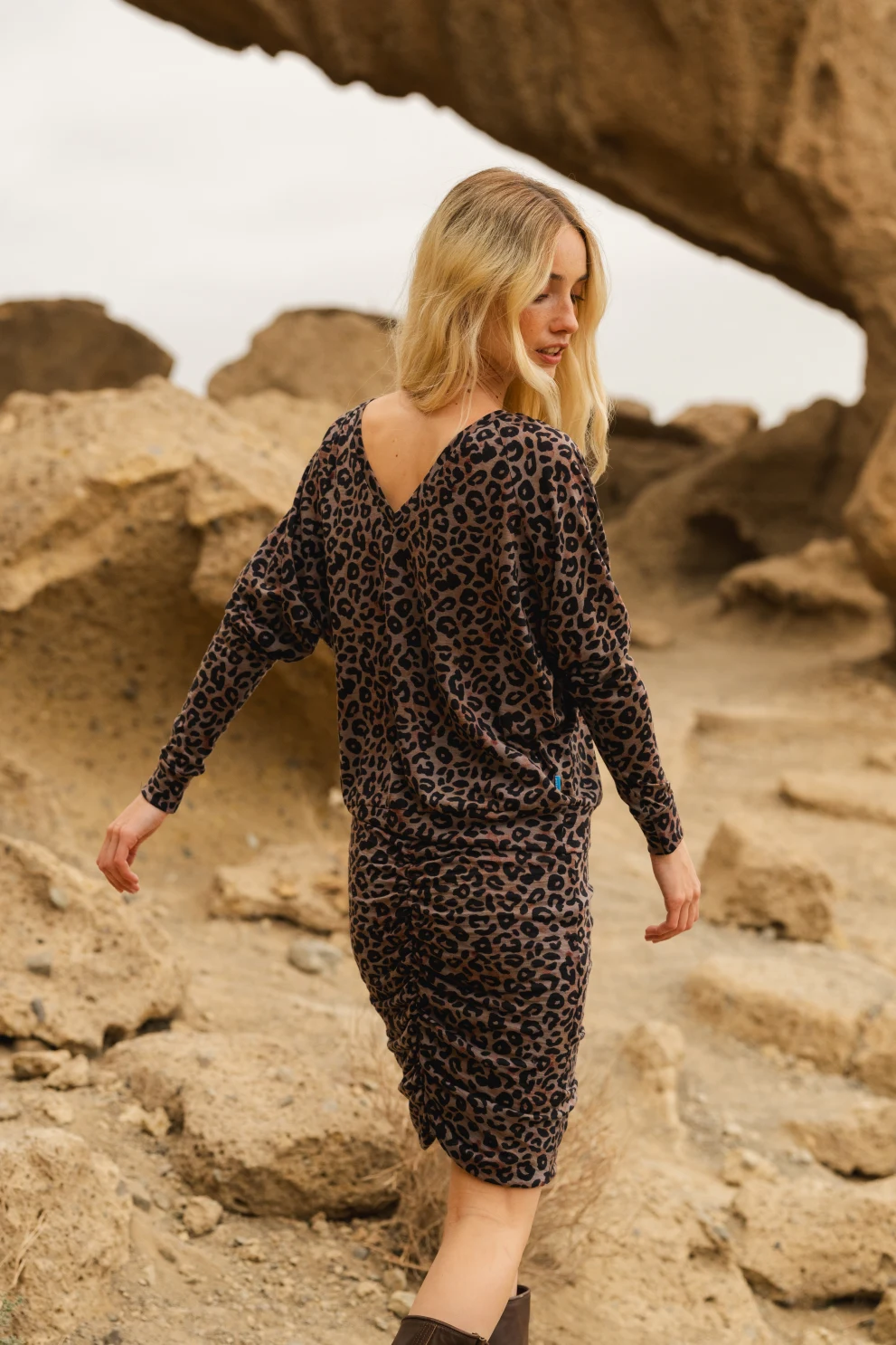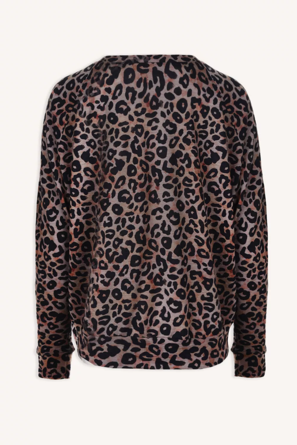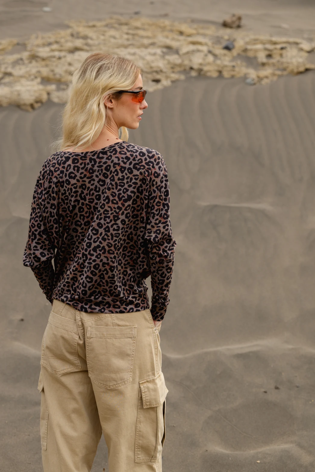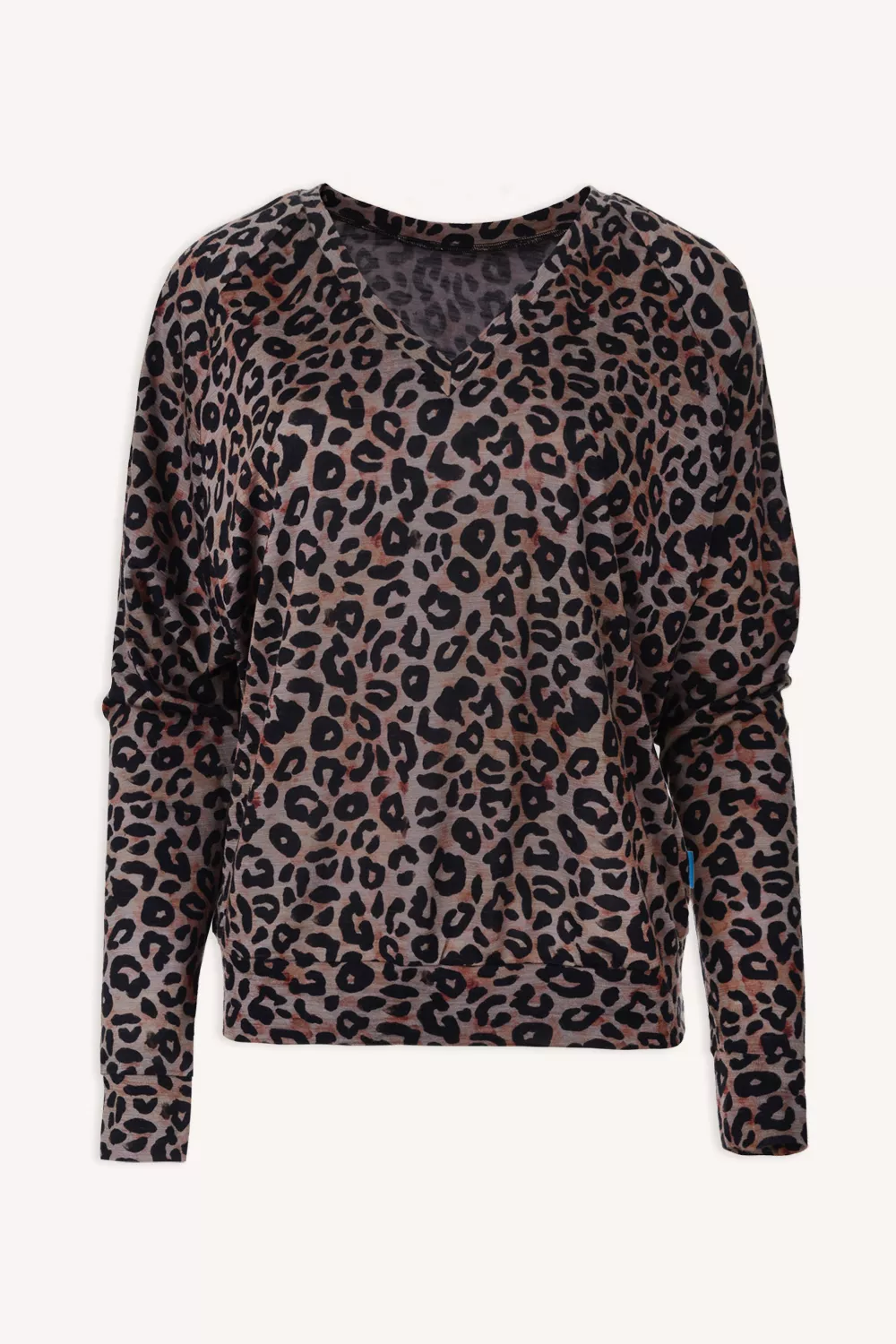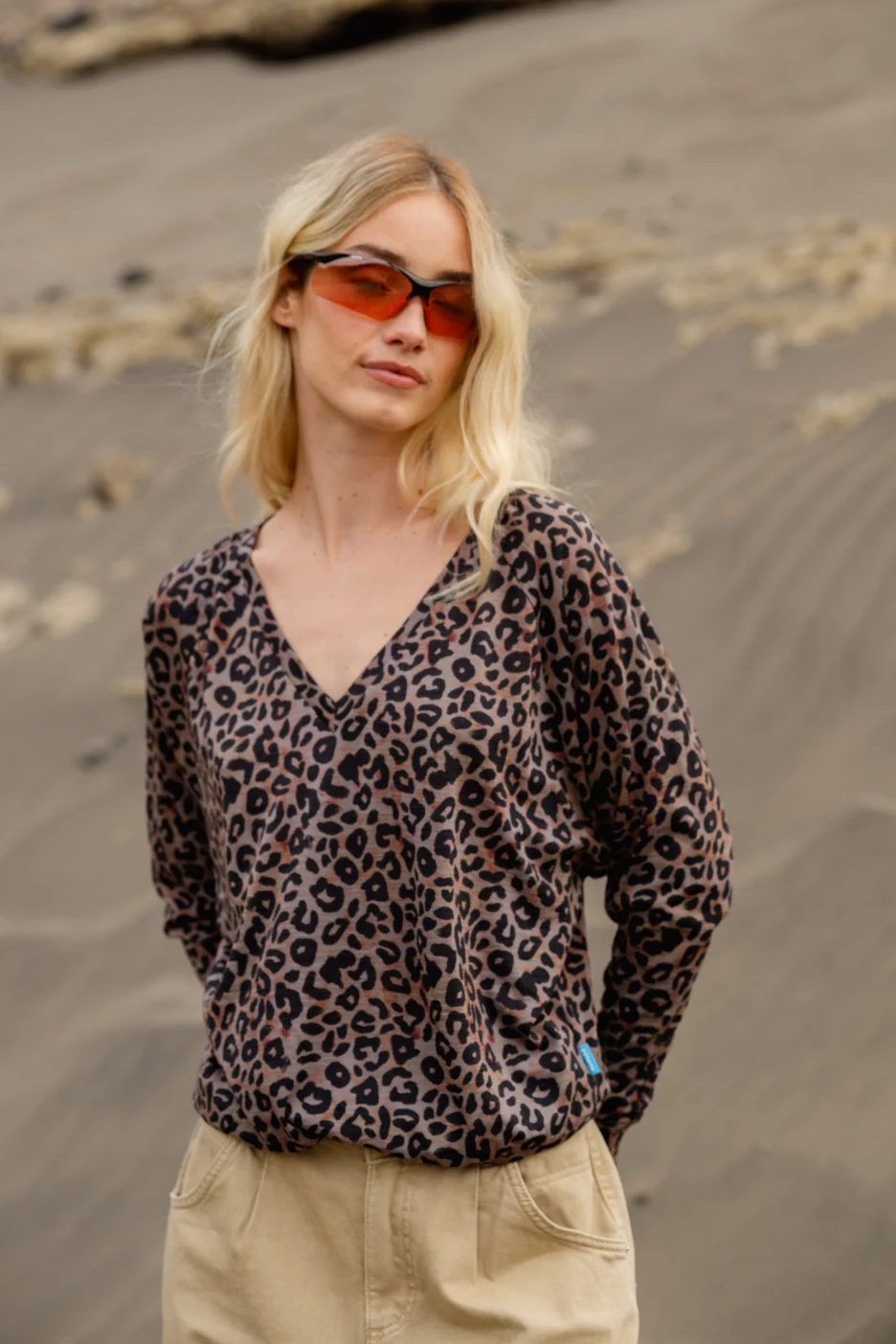 Merino halenka s netopýřím rukávem a výstřihem do V dámské – černý leopard (135 g)