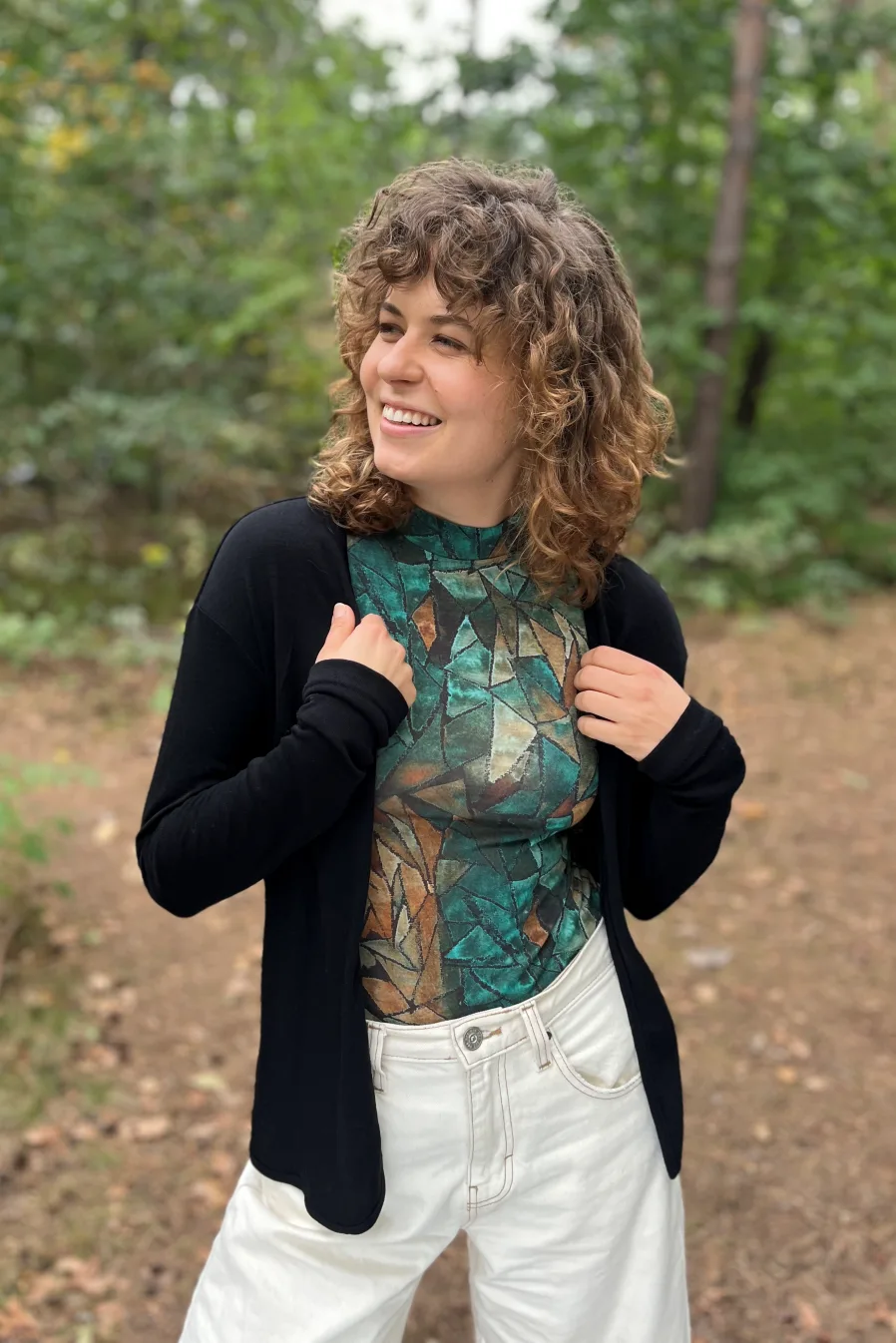 Kardigan je otevřený, bez knoflíků, zakončený jemným obloukem podél okrajů.