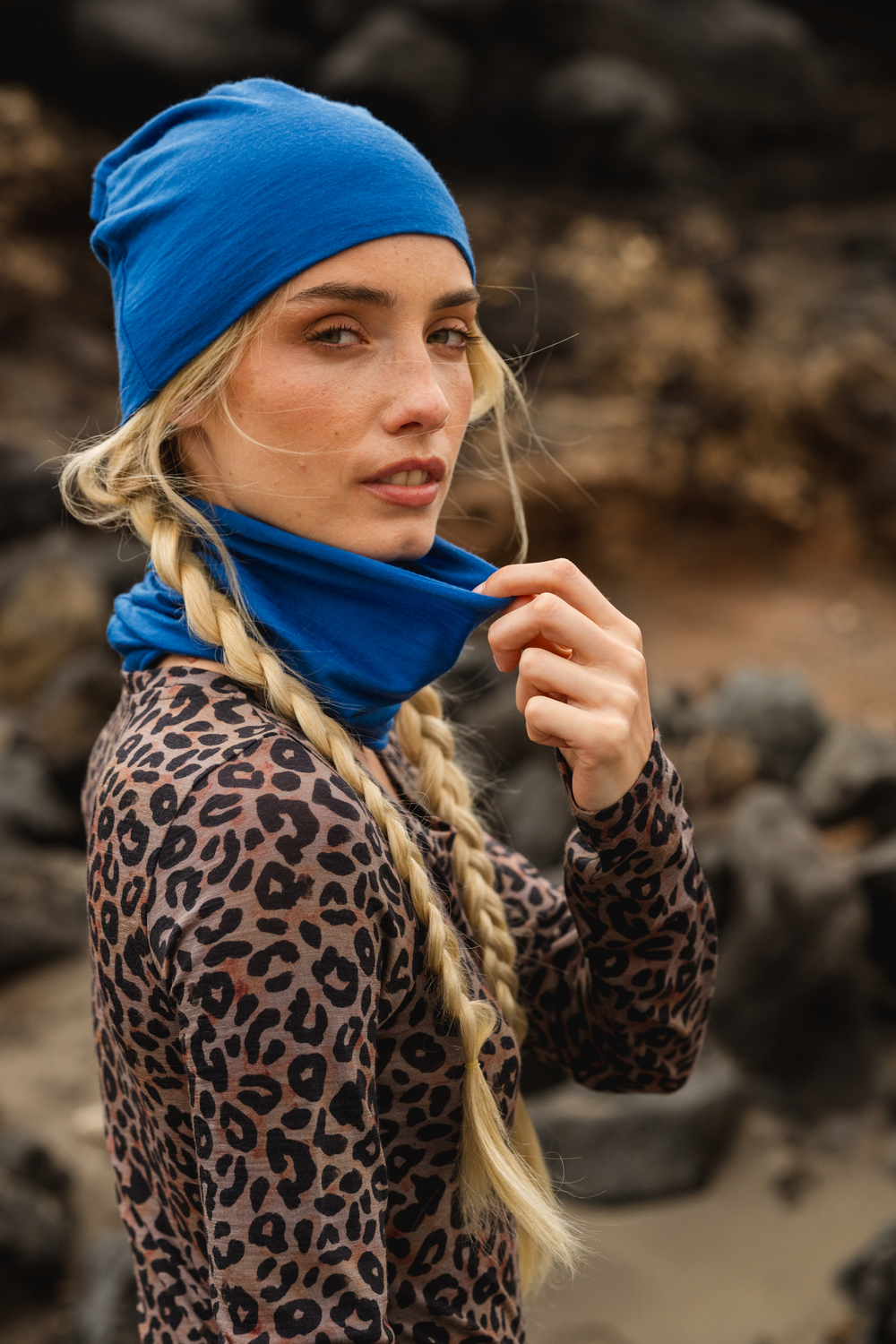 Díky výjimečným vlastnostem 100% merino vlny je tento modrý merino nákrčník vhodný pro celoroční nošení. Přirozená struktura vláken efektivně odvádí vlhkost od těla, pomáhá udržet pocit sucha a svěžesti a umožňuje pokožce dýchat v teple, zatímco v chladném počasí příjemně hřeje. Merino vlna je přirozeně antibakteriální a termoregulační, proto se skvěle hodí na intenzivní pohyb i běžné nošení.