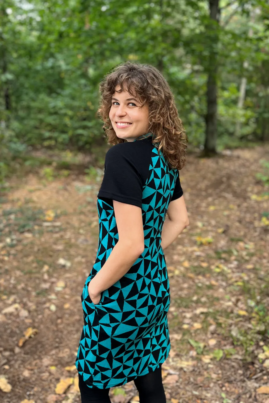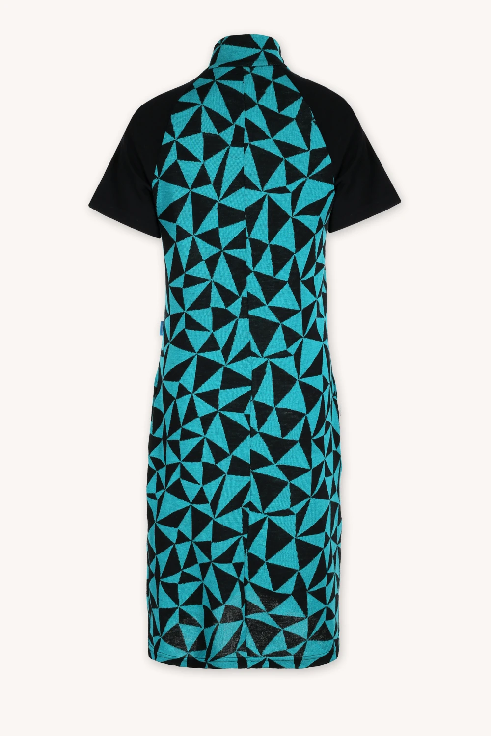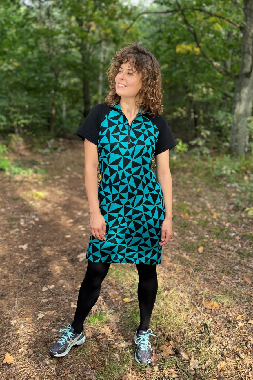 Geometrický tyrkysově-černý vzor dodává šatům moderní, energický vzhled.