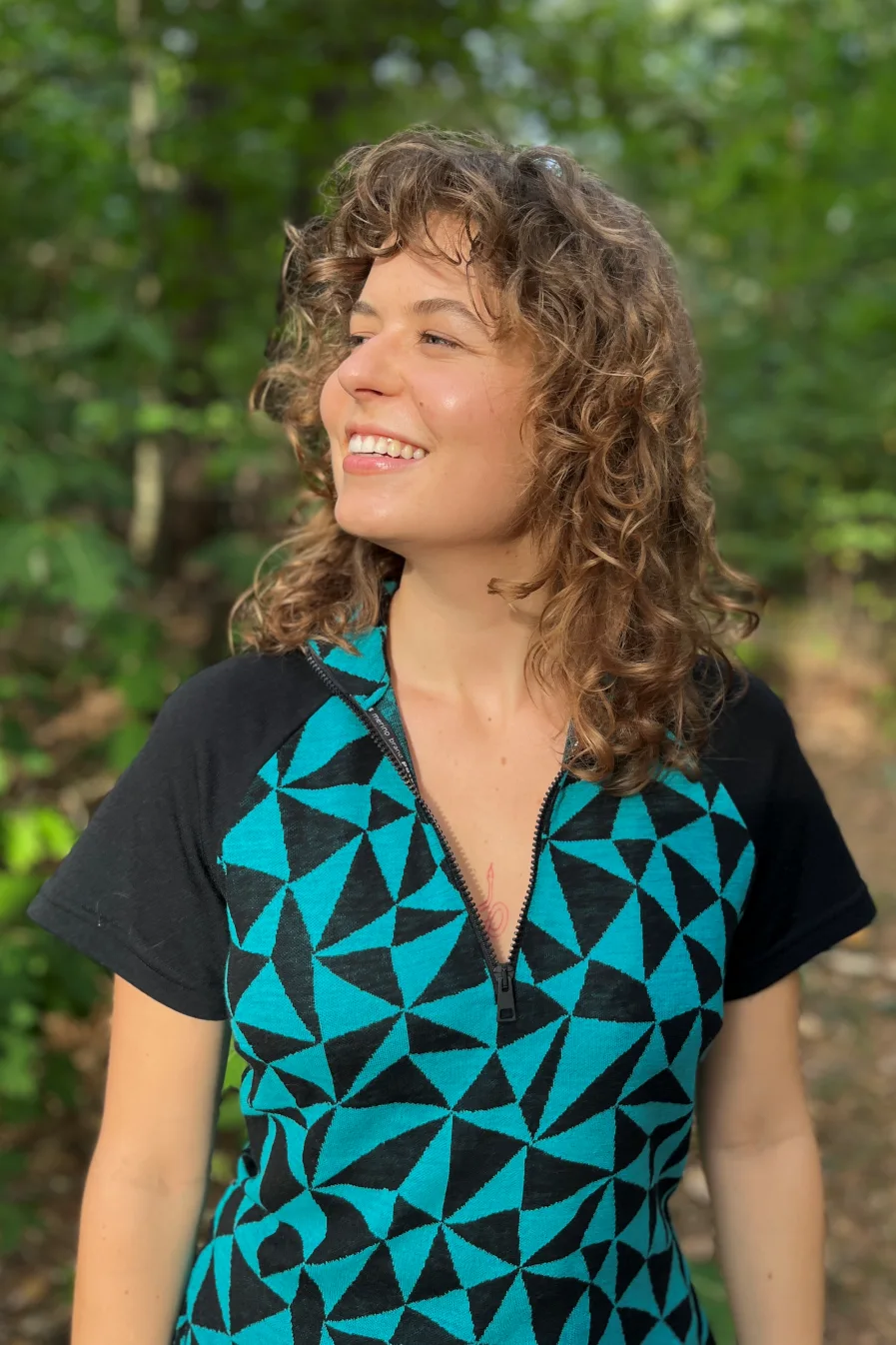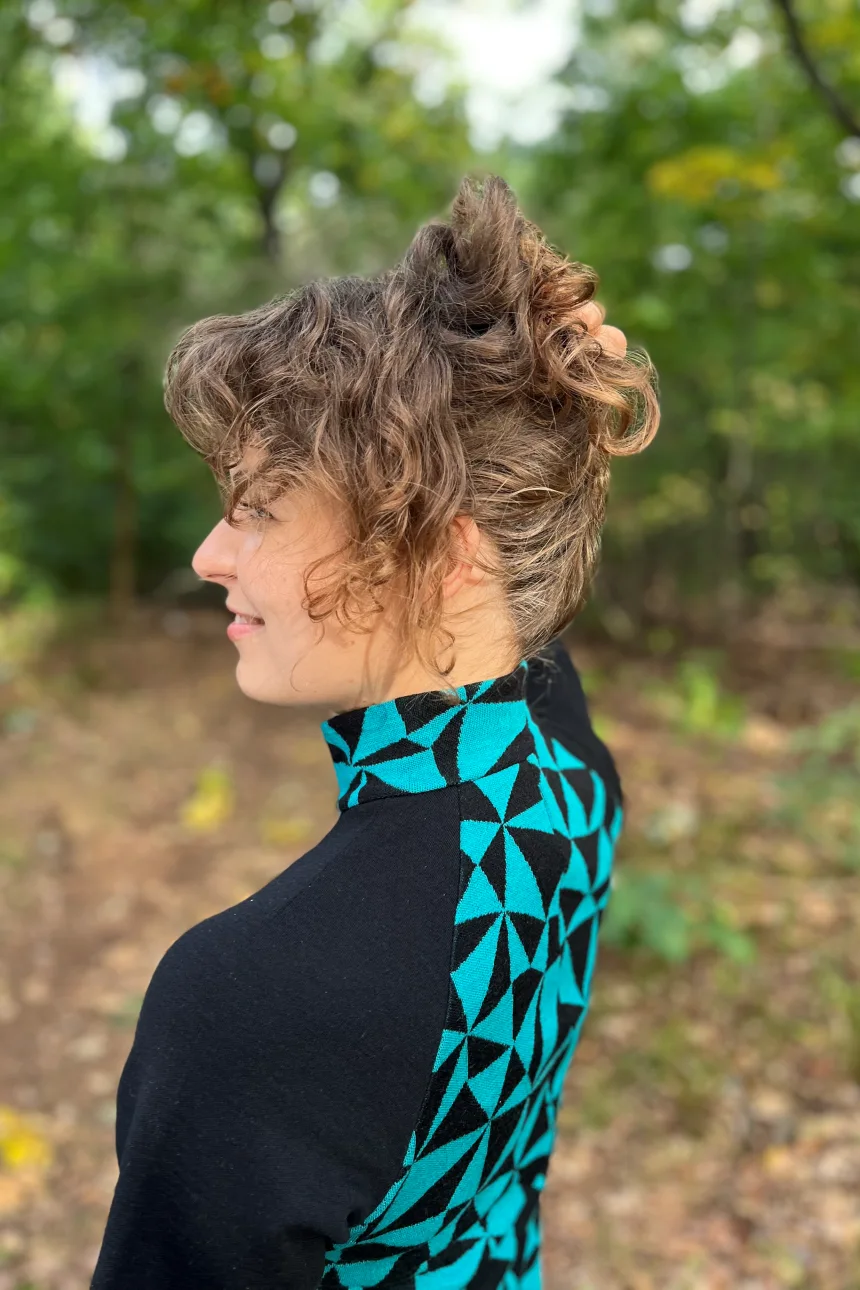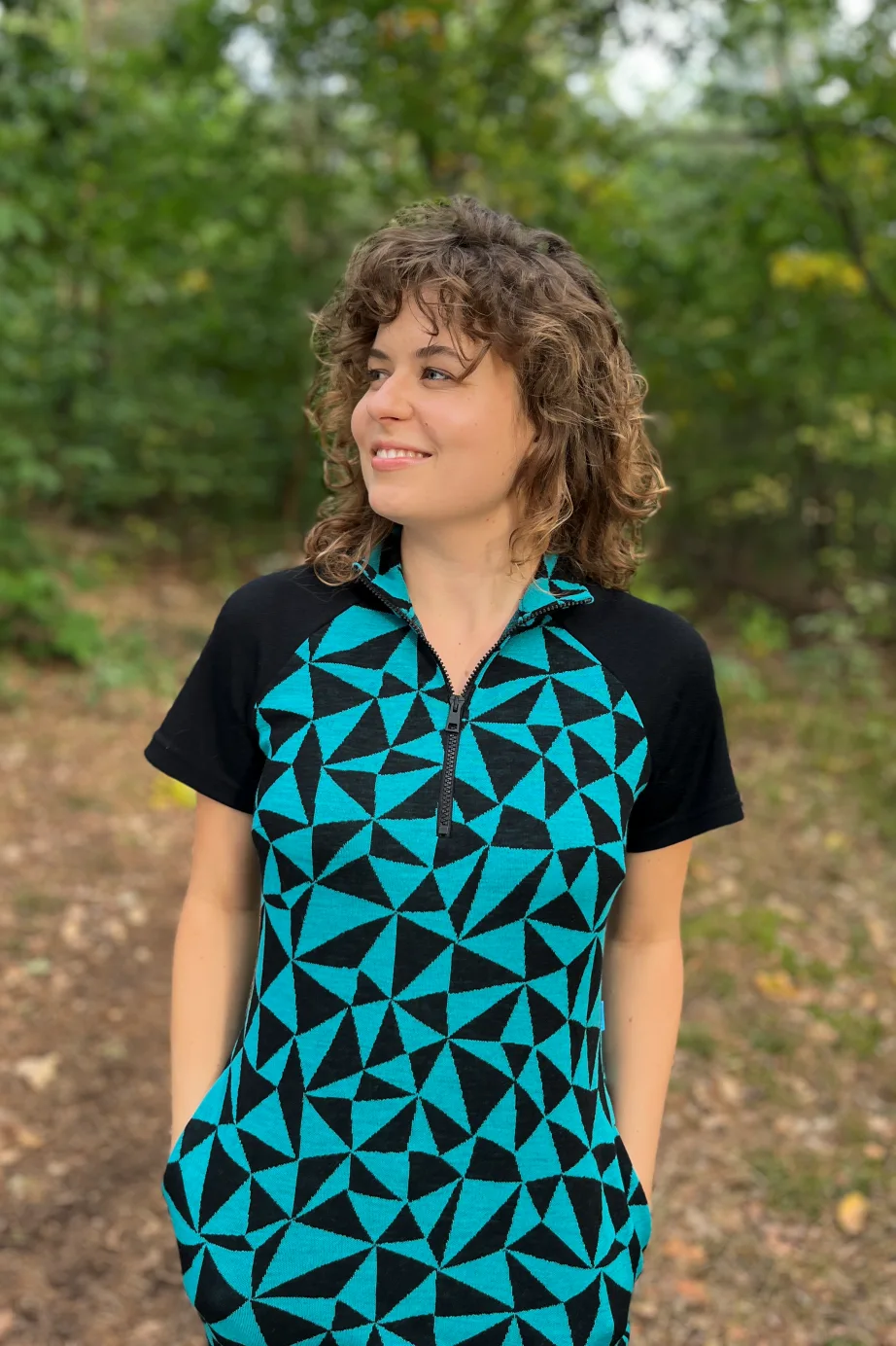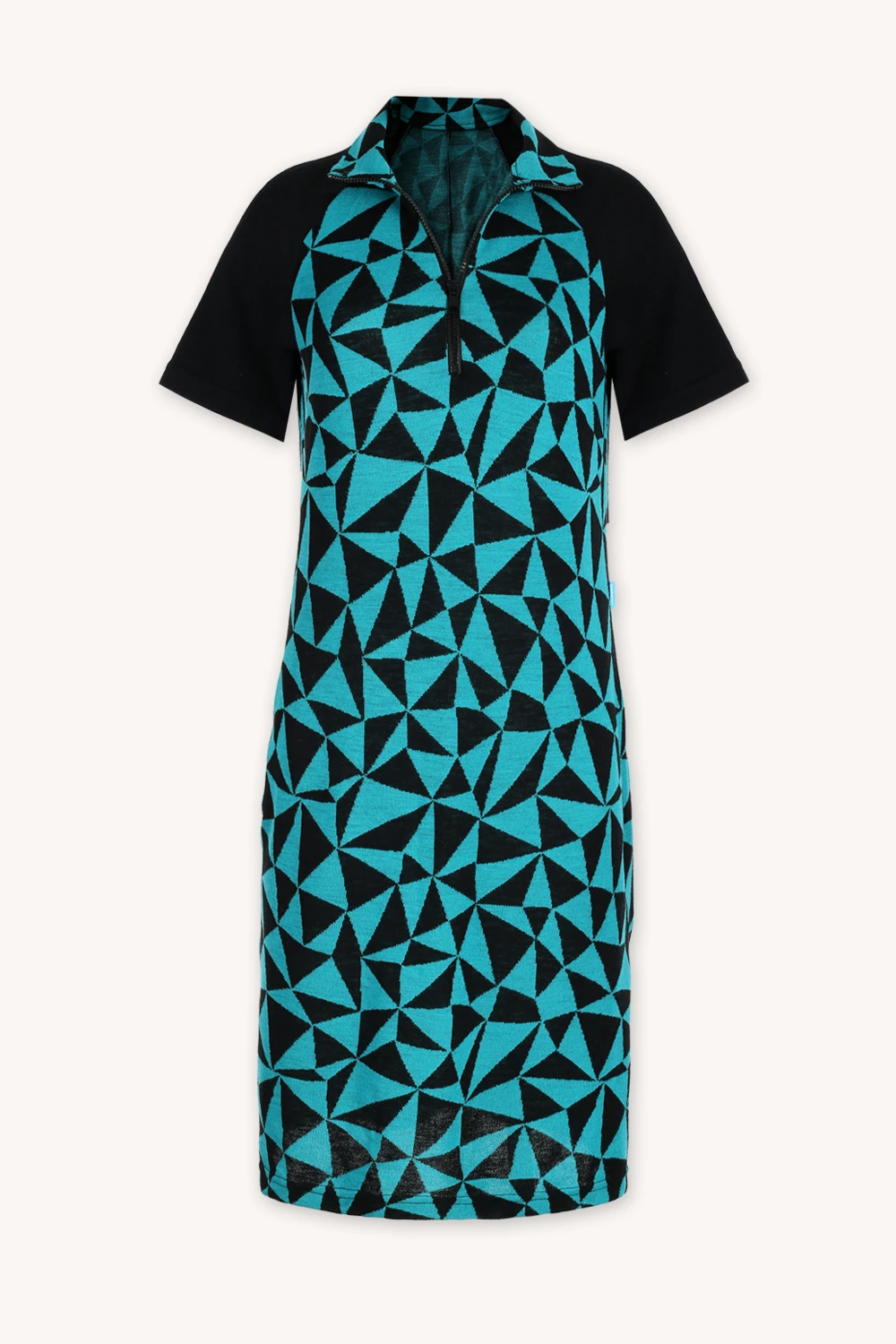 Geometrický tyrkysově-černý vzor dodává šatům moderní, energický vzhled.
