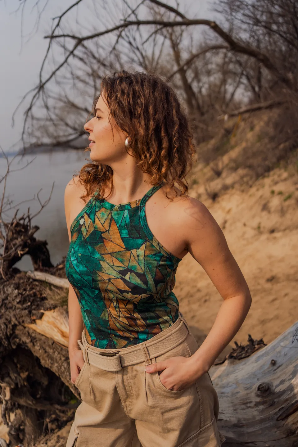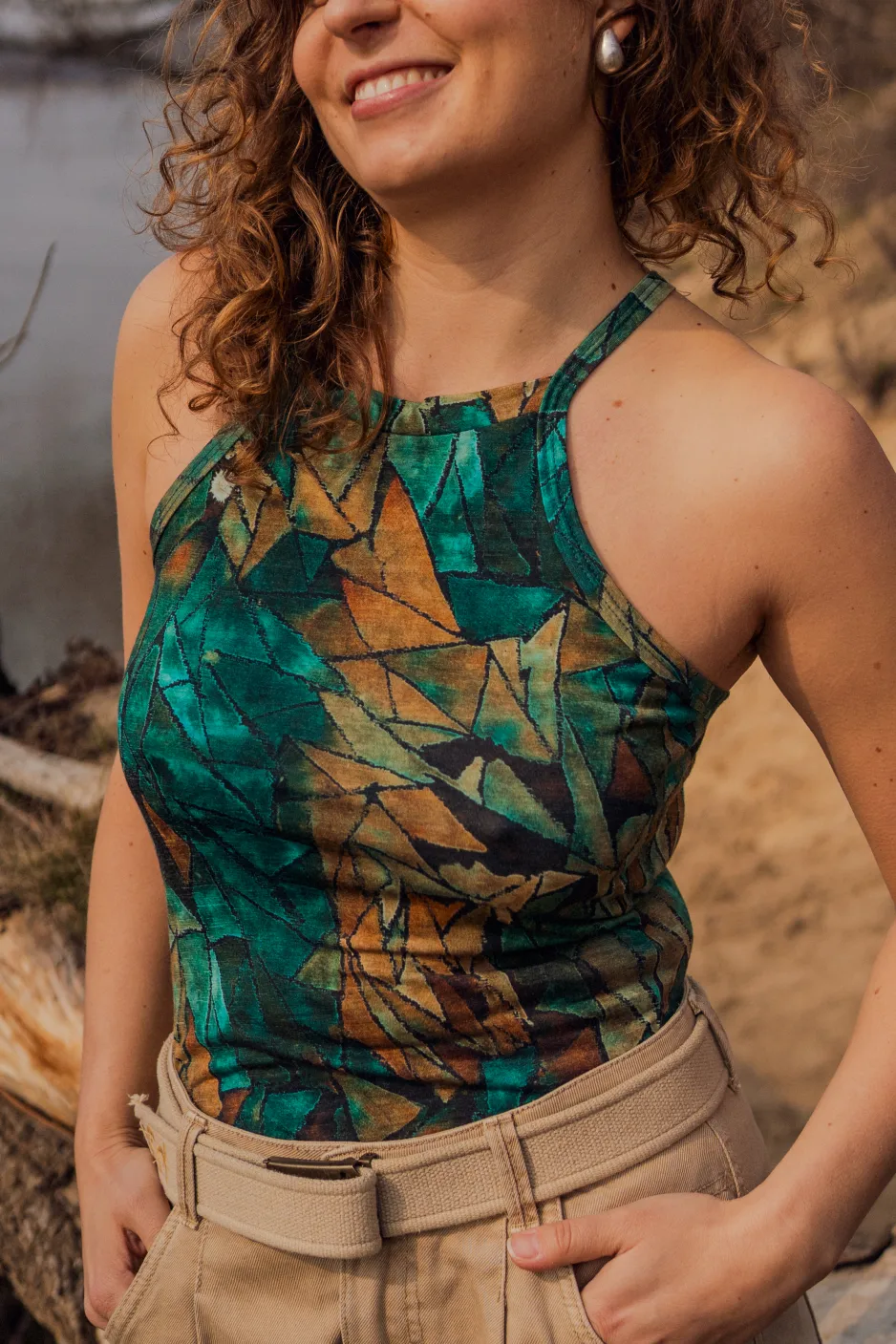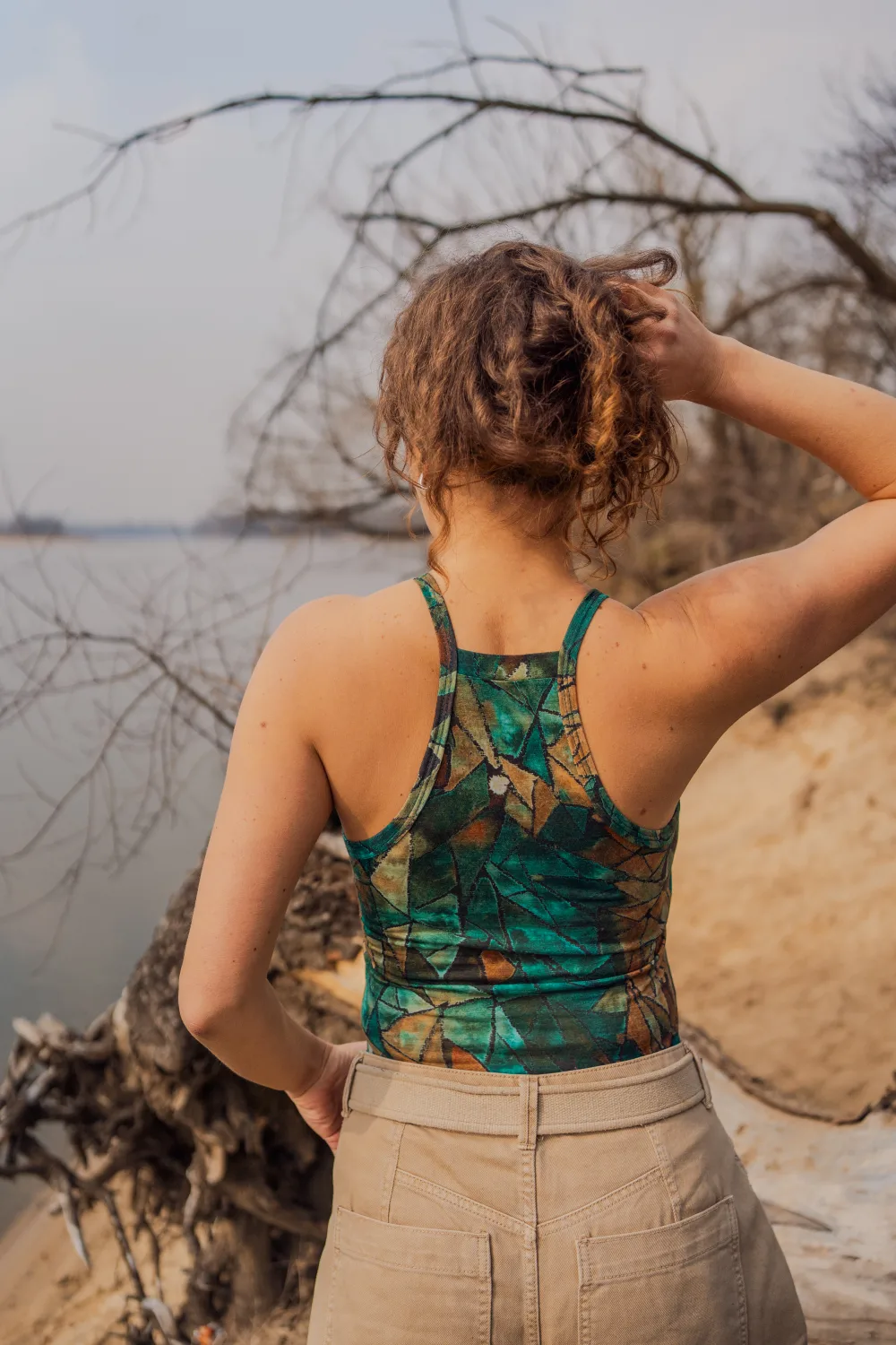 Zelený tank top ze 100% merino vlny je lehký, přiléhavý a na těle téměř neznatelný – v létě se snadno stane tvým nejoblíbenějším kouskem. Vzor byl vytvořen jako ručně malovaný motiv, díky čemuž je každý kus jedinečný.