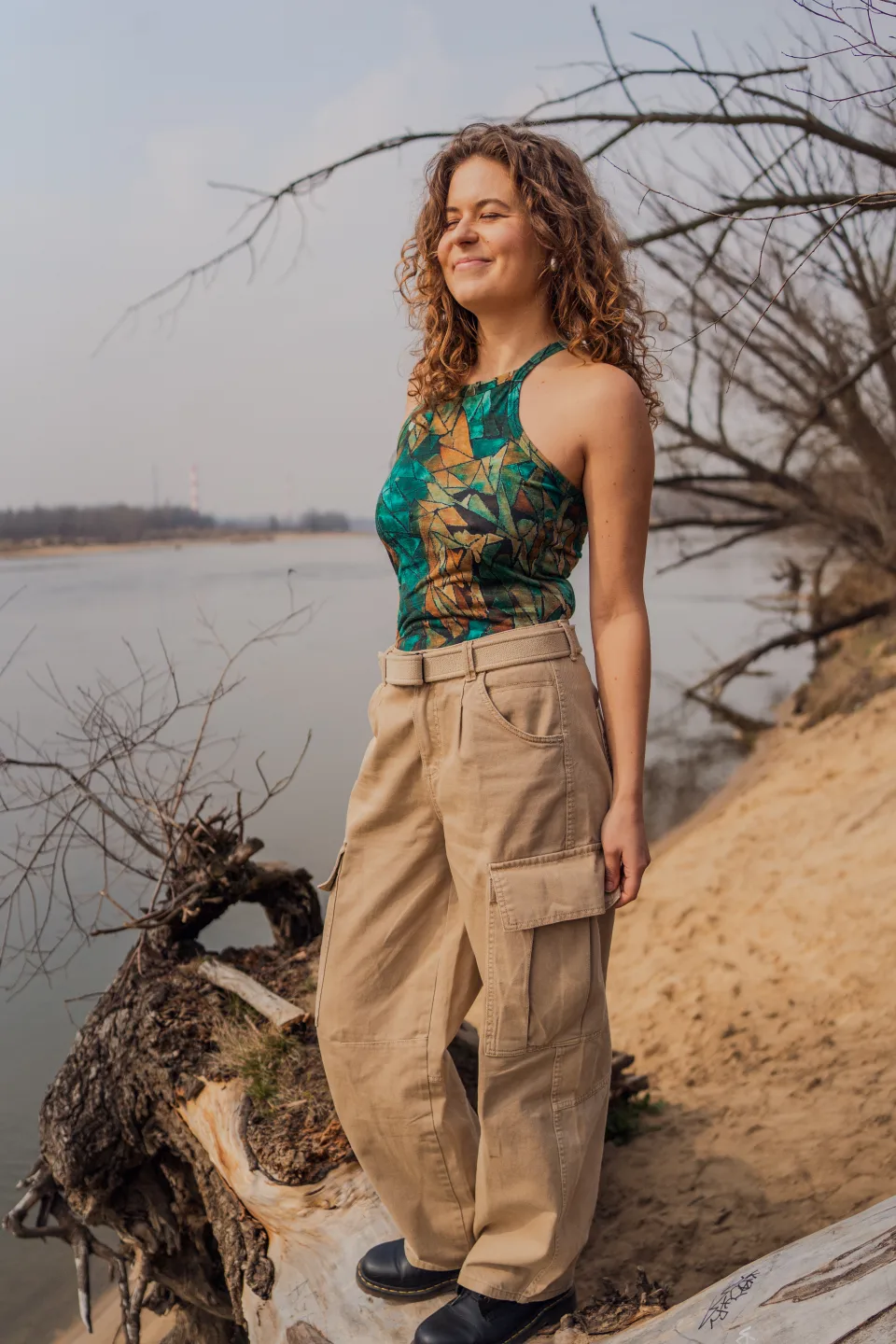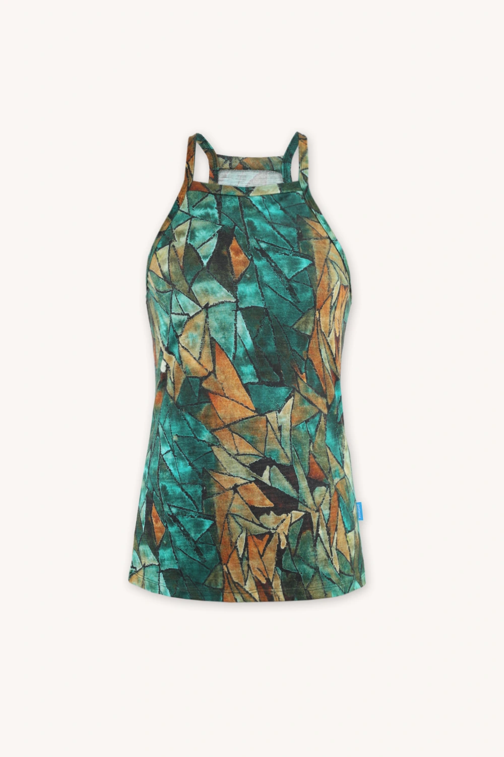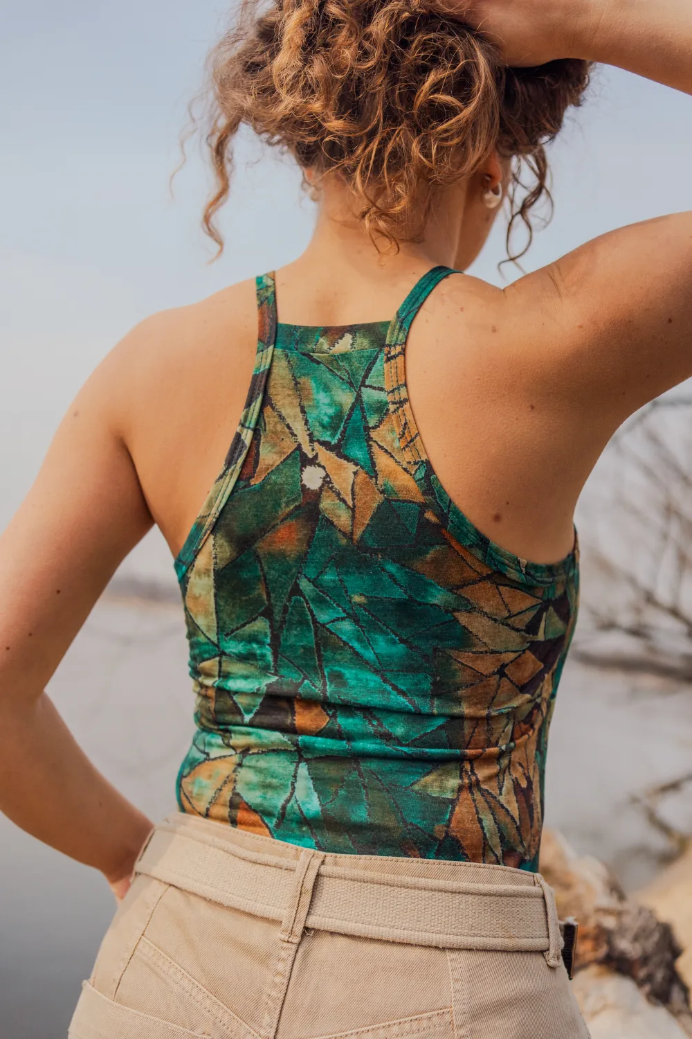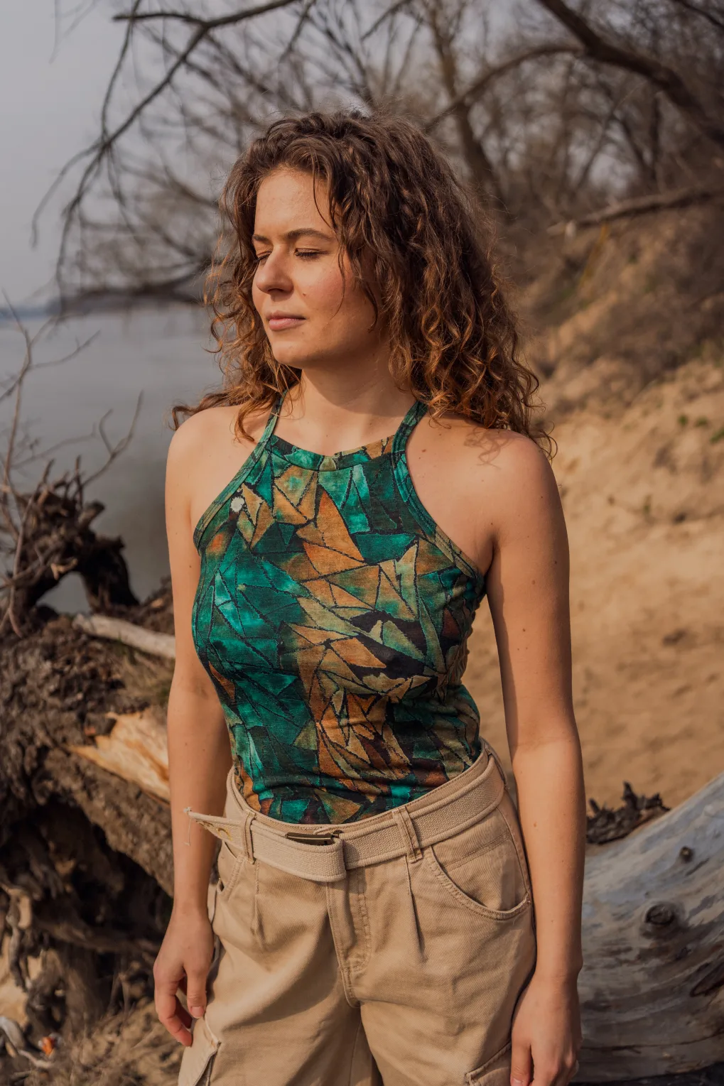 Zelený tank top ze 100% merino vlny je lehký, přiléhavý a na těle téměř neznatelný – v létě se snadno stane tvým nejoblíbenějším kouskem. Vzor byl vytvořen jako ručně malovaný motiv, díky čemuž je každý kus jedinečný.