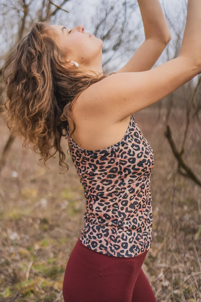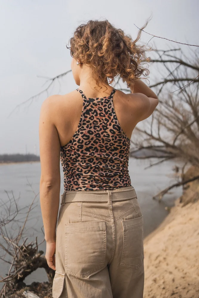 Lehký, přiléhavý a téměř neznatelný na těle – tento dámský merino tank top s ručně malovaným leopardím vzorem se stane tvým nejoblíbenějším letním kouskem. Ušitý v Polsku ze 100% merino vlny, nabízí maximální pohodlí, prodyšnost a přirozenou termoregulaci.