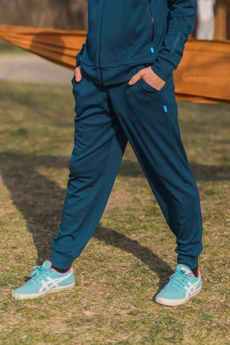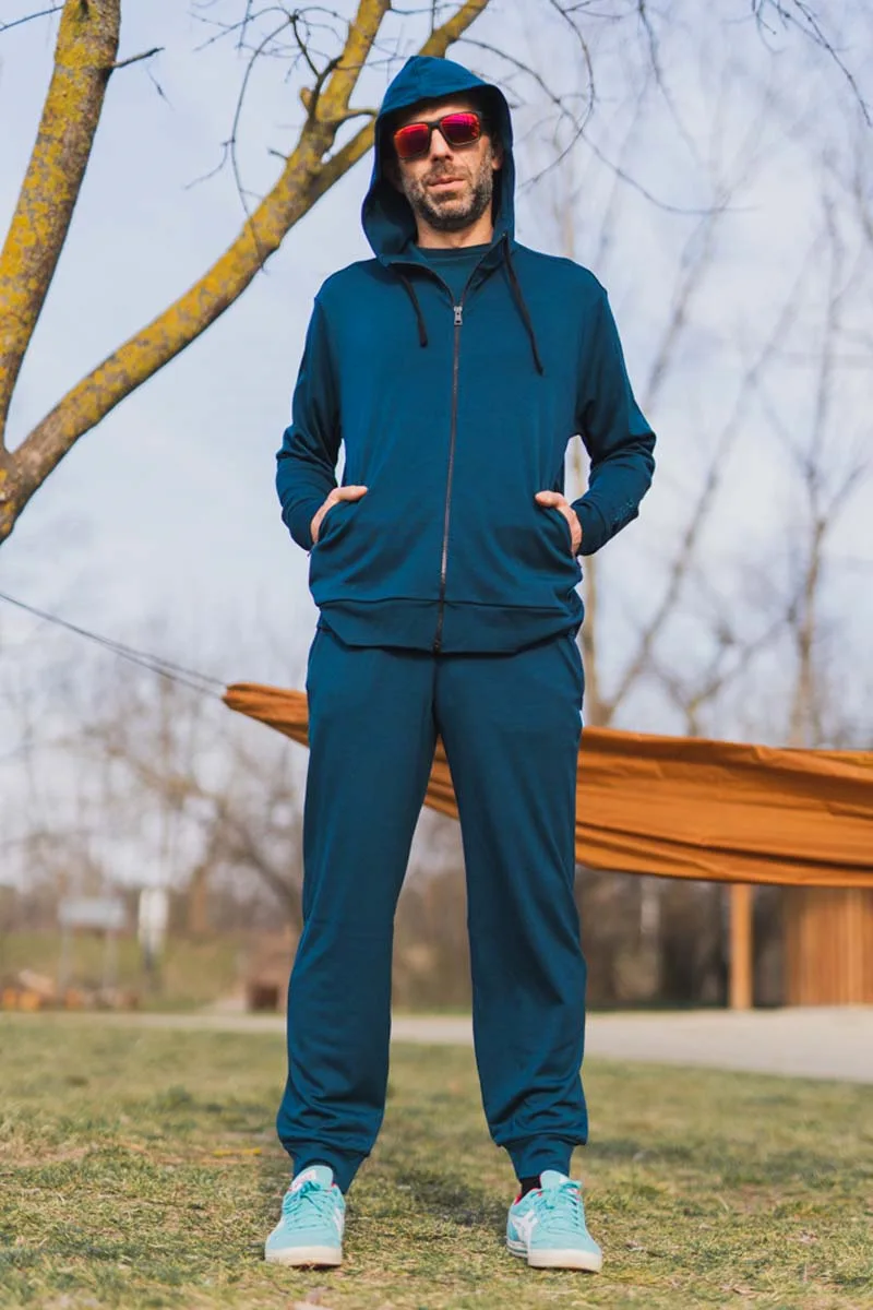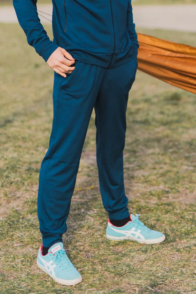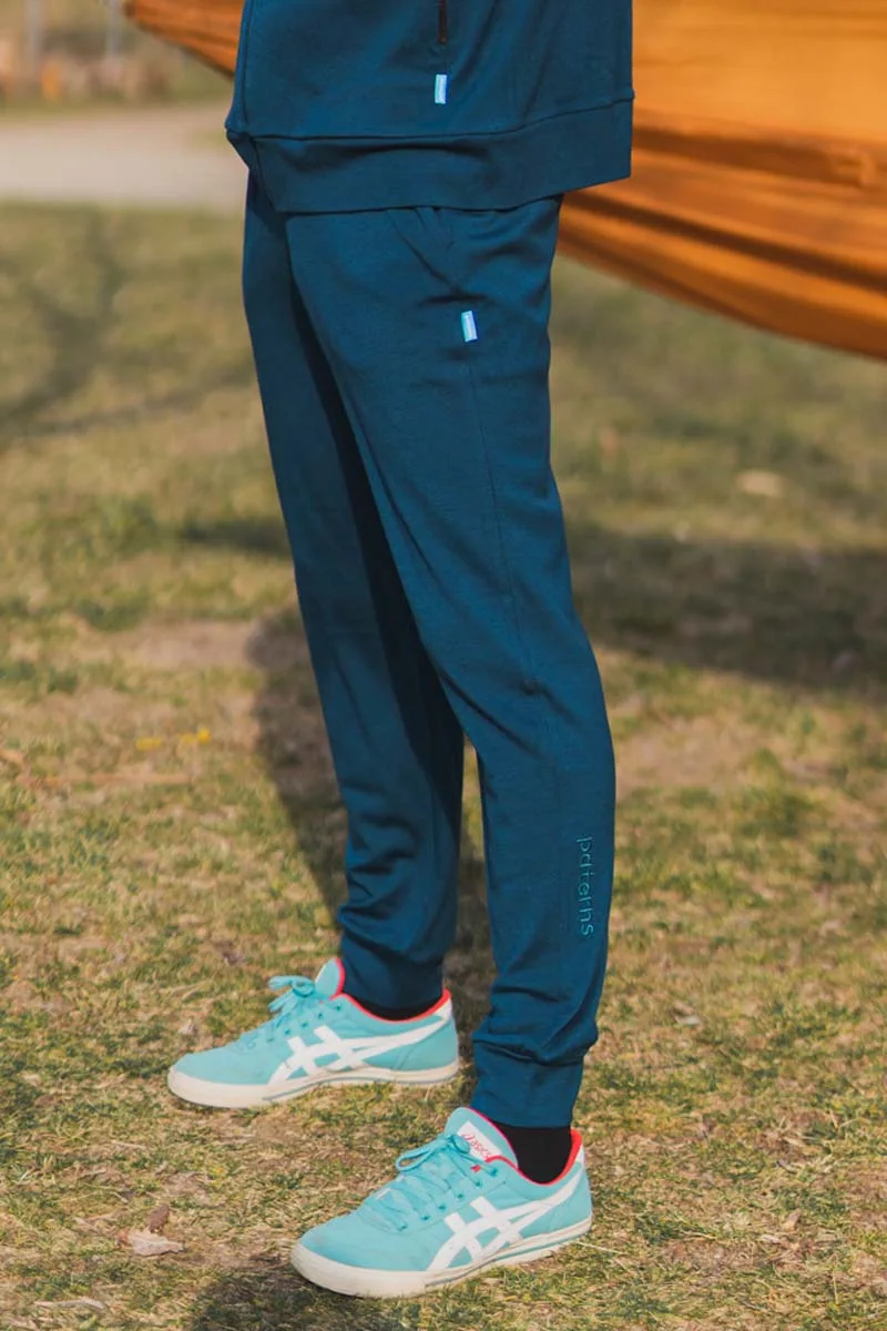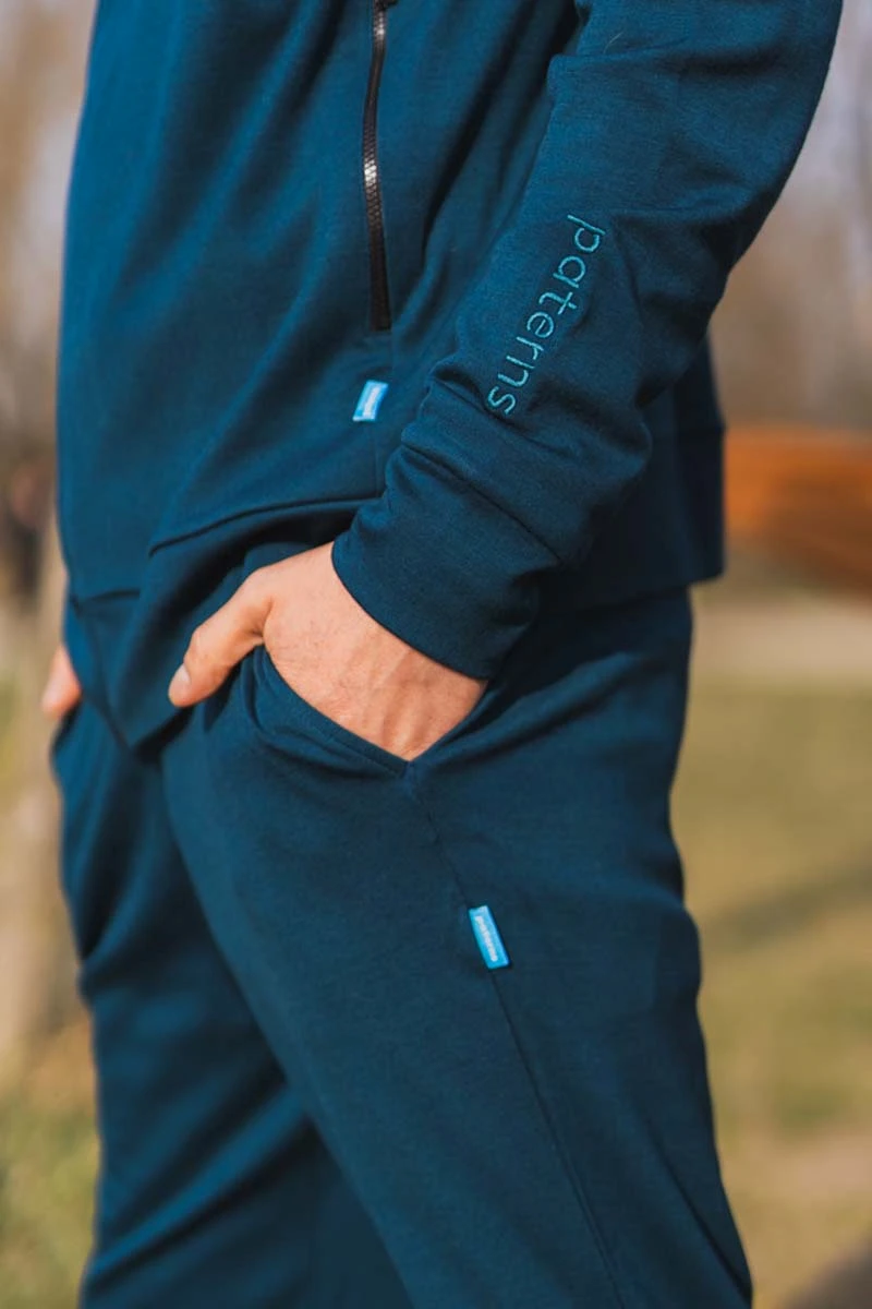 Tepláky ze 100% merino vlny v hlubokém odstínu petrol – lehké, pohodlné a naprosto ideální.