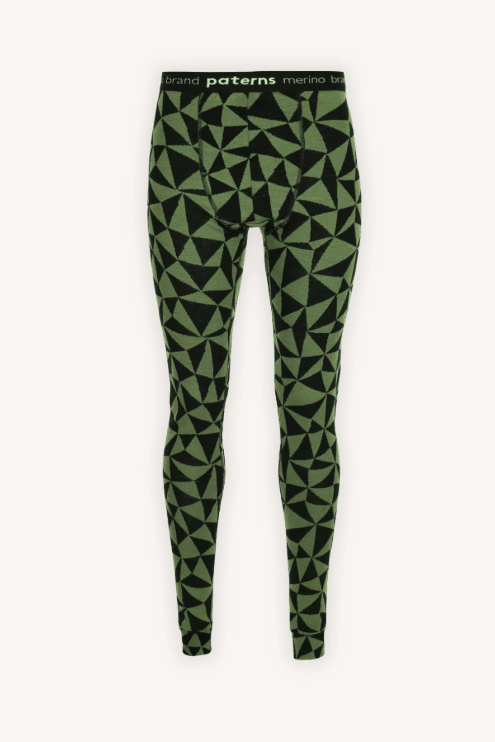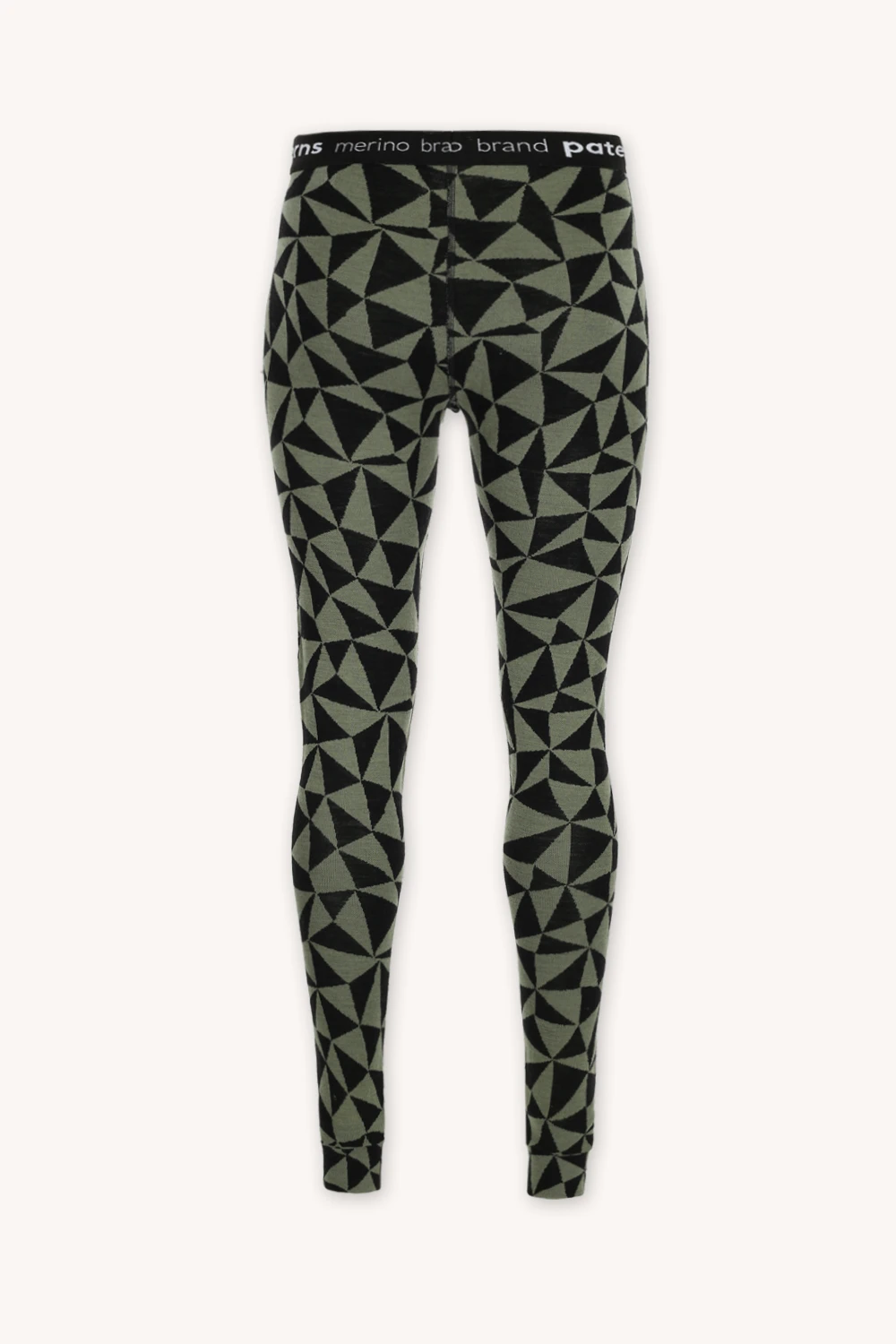Velmi teplé, termoaktivní legíny z 100% merino vlny ve vzoru olivově-černé trojúhelníky.