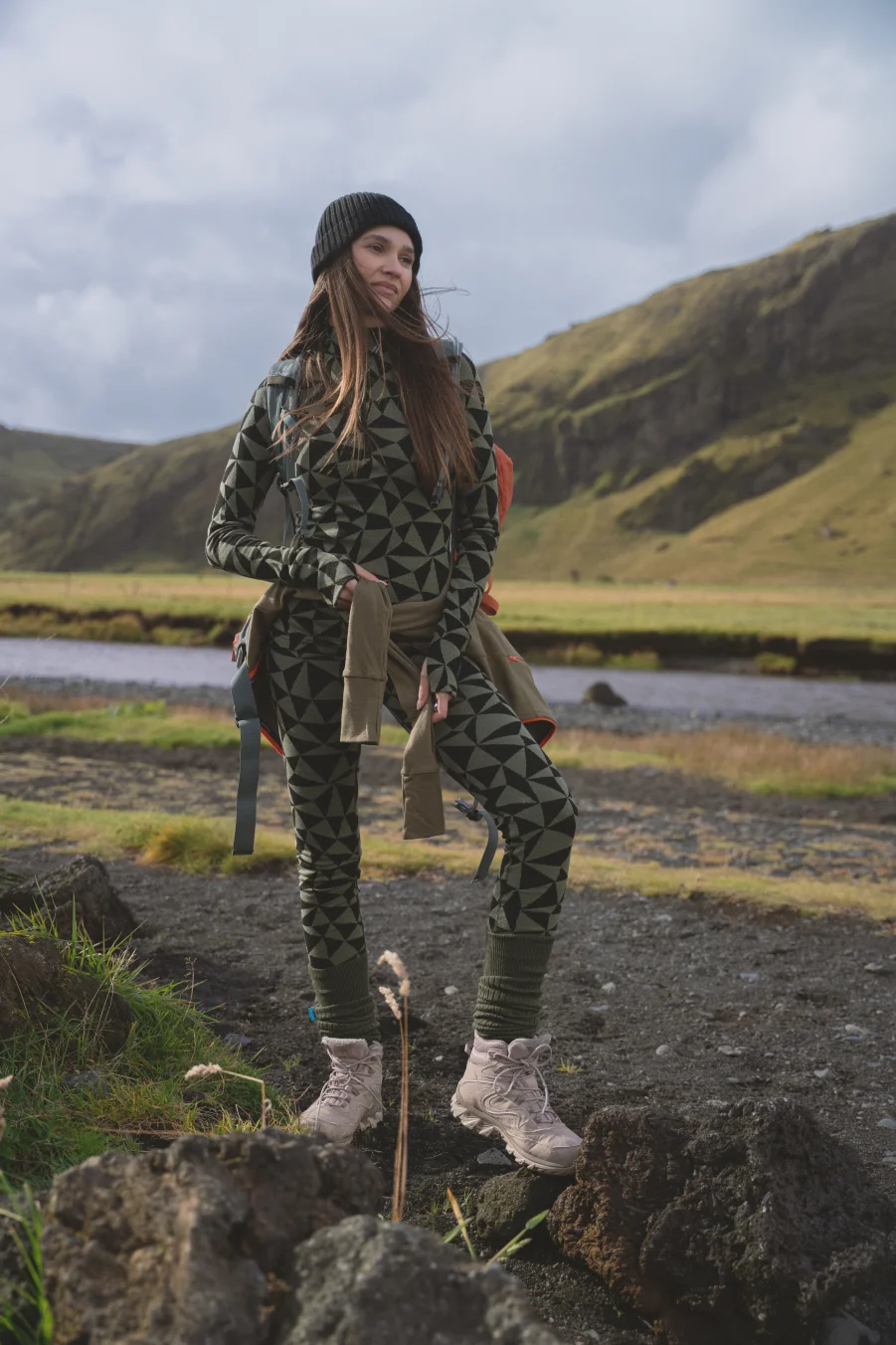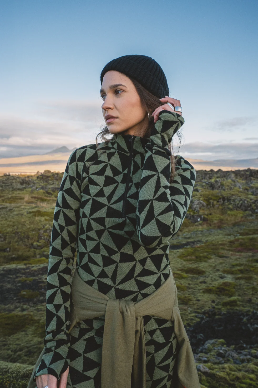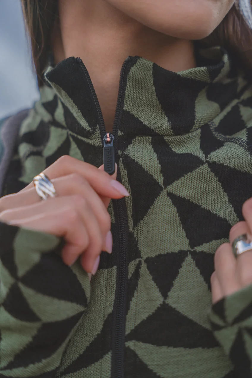 Velmi teplé, termoaktivní triko z 100% merino vlny s dlouhým rukávem a polovičním zipem u krku ve vzoru olivově-černé trojúhelníky.