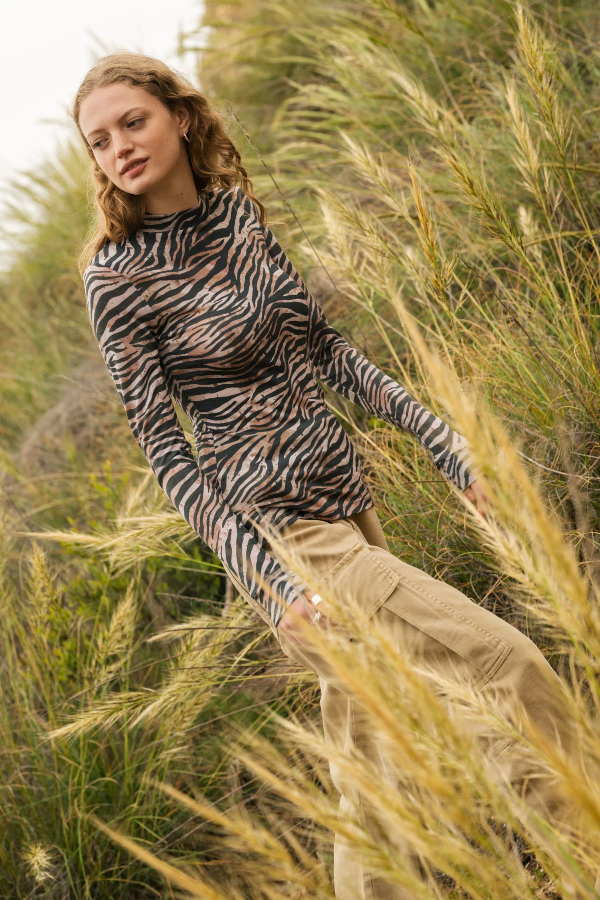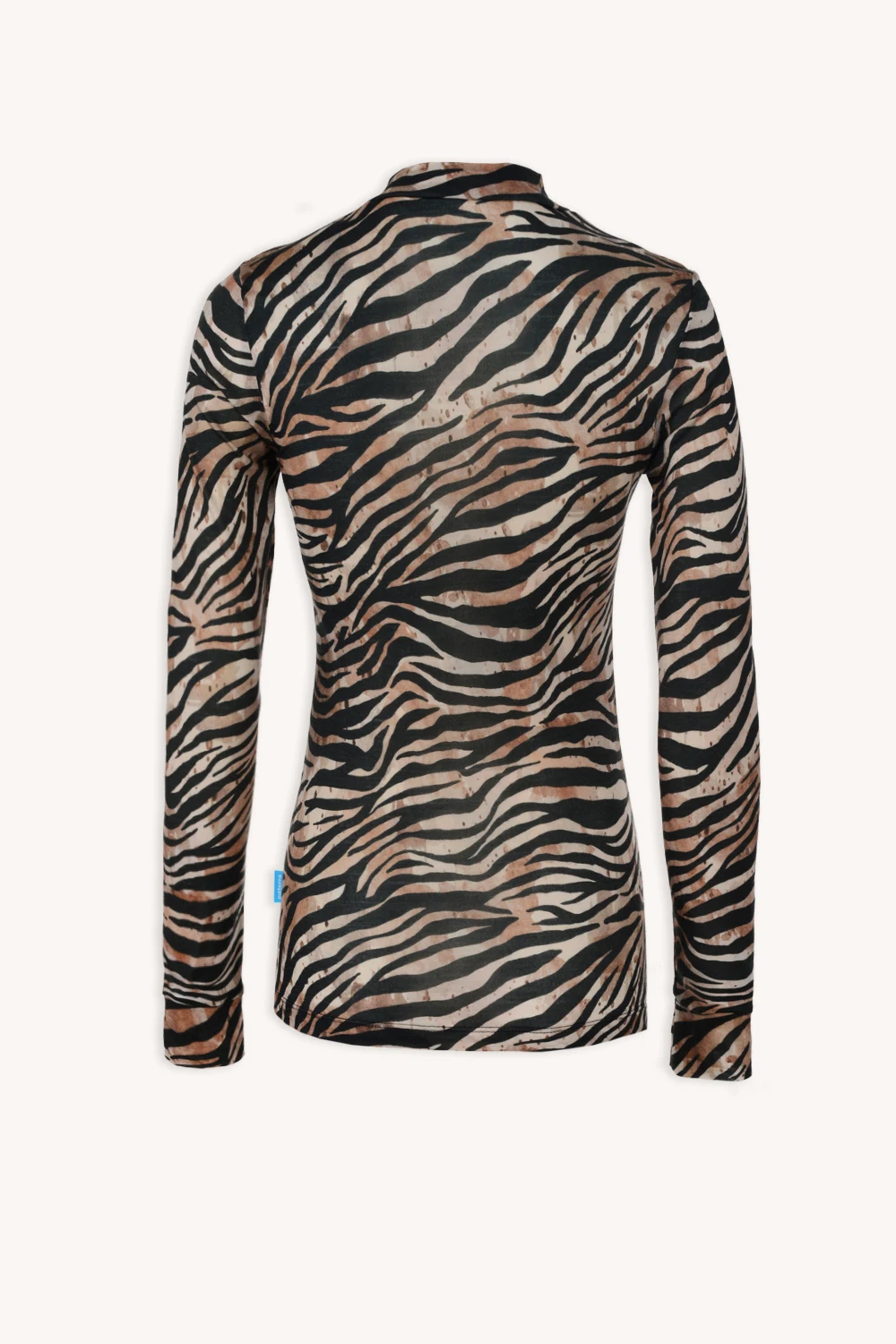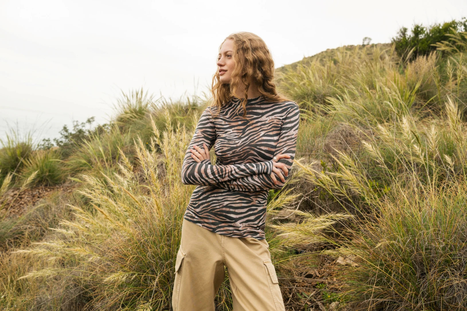 Dámské merino tričko s dlouhým rukávem a stojáčkem z kolekce active ve vzoru zebra (zvířecí vzor) je ideální volbou pro sport i každodenní nošení v chladnějším počasí. Funguje skvěle jako termoprádlo i jako samostatná funkční vrstva při aktivitách venku. Výrazný zvířecí vzor zebra dodává tričku moderní a nepřehlédnutelný vzhled.