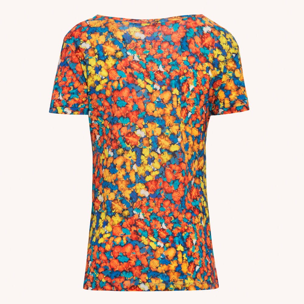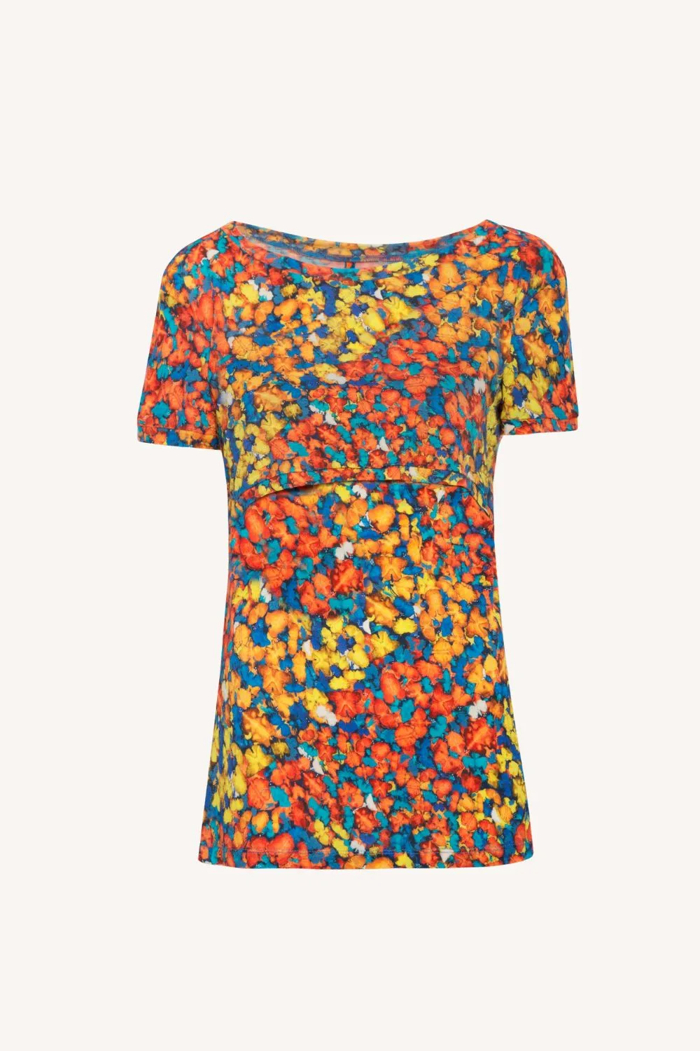 Originální kojicí tričko z 100% merino vlny ve vzorovaném motivu papilio v tónech oranžové, žluté a modré přináší pozitivní energii a přirozenou funkčnost.