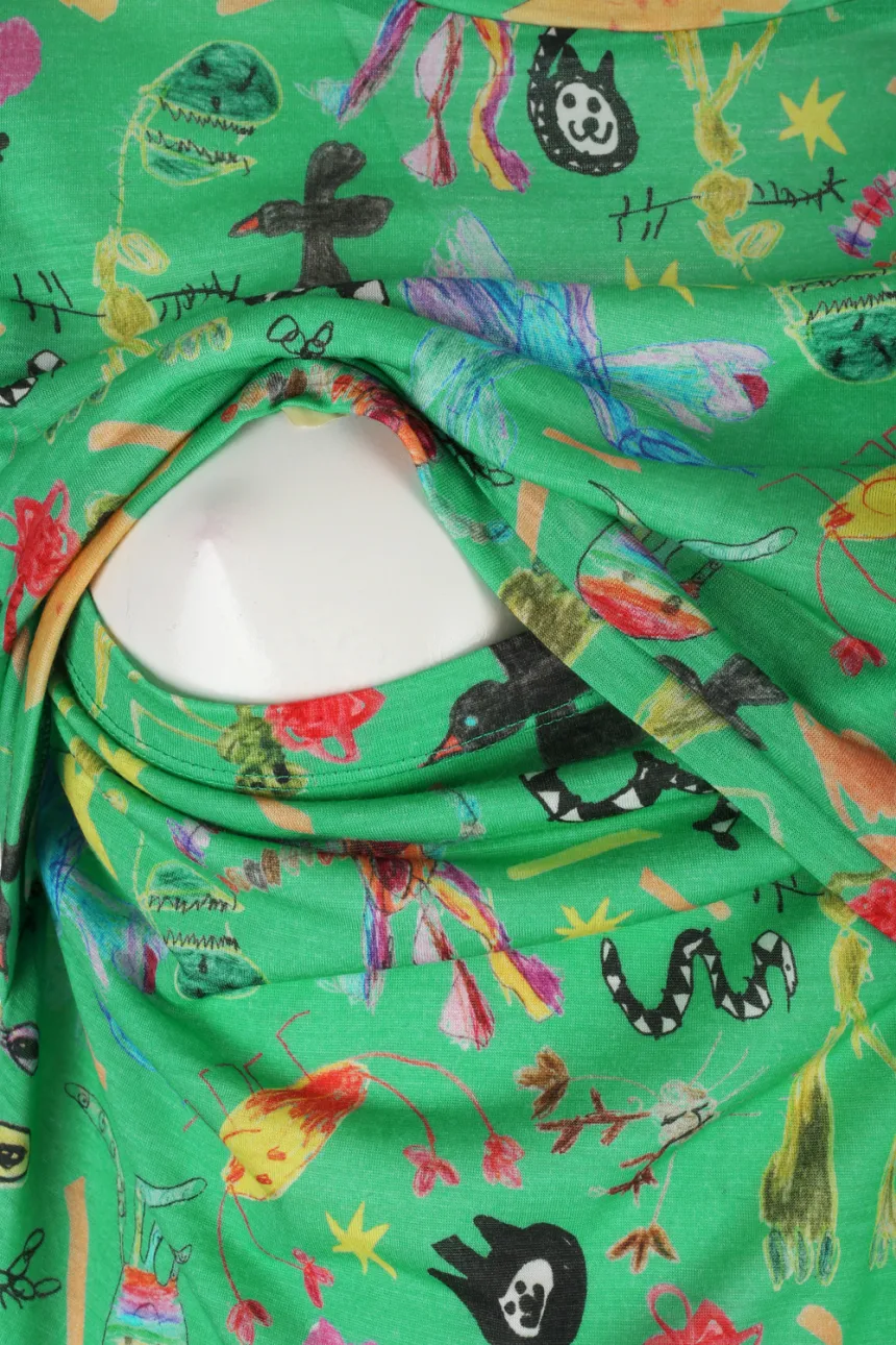 Měkké, prodyšné a funkční kojicí tričko z 100% merino vlny ve vzoru pixie (zelený autorský motiv) je ideální volbou pro maminky, které chtějí pohodlí, přirozenost a styl. Merino vlna je mimořádně jemná – šetrná k citlivé pokožce maminky i miminka.