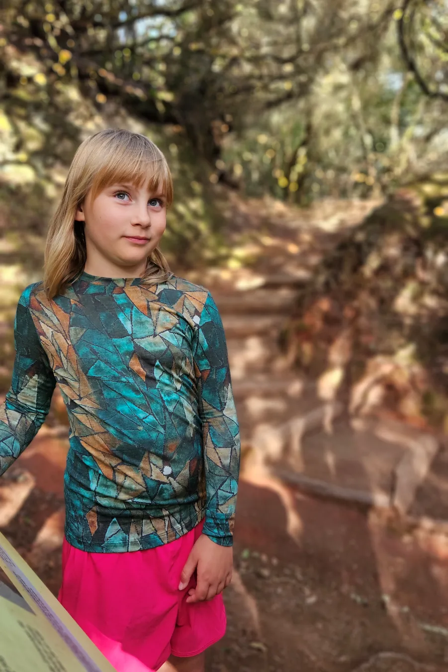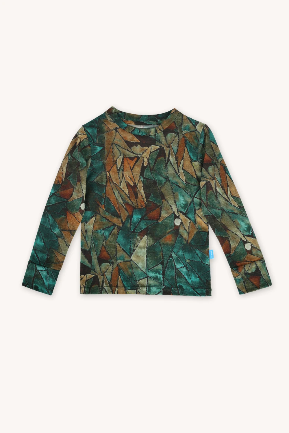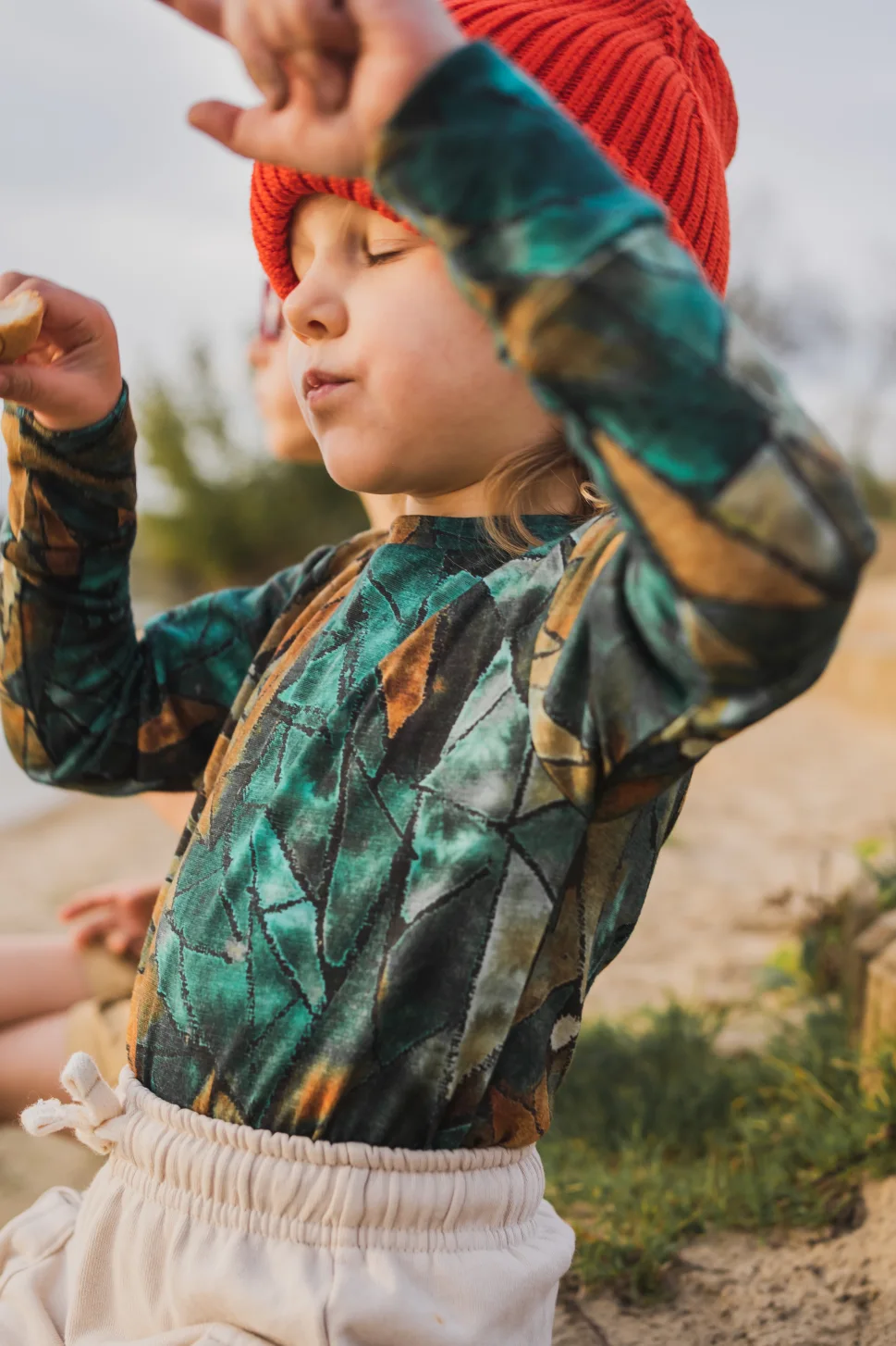 Tenké a pružné dětské merino tričko s dlouhým rukávem ve vzoru green gorpcore je vyrobené z jemného úpletu z 100% merino vlny.