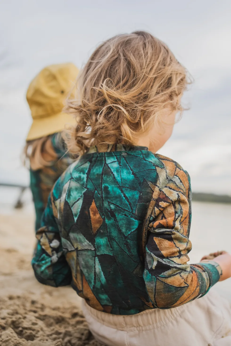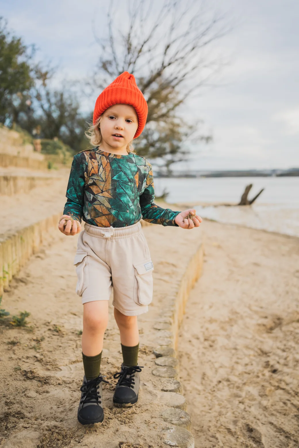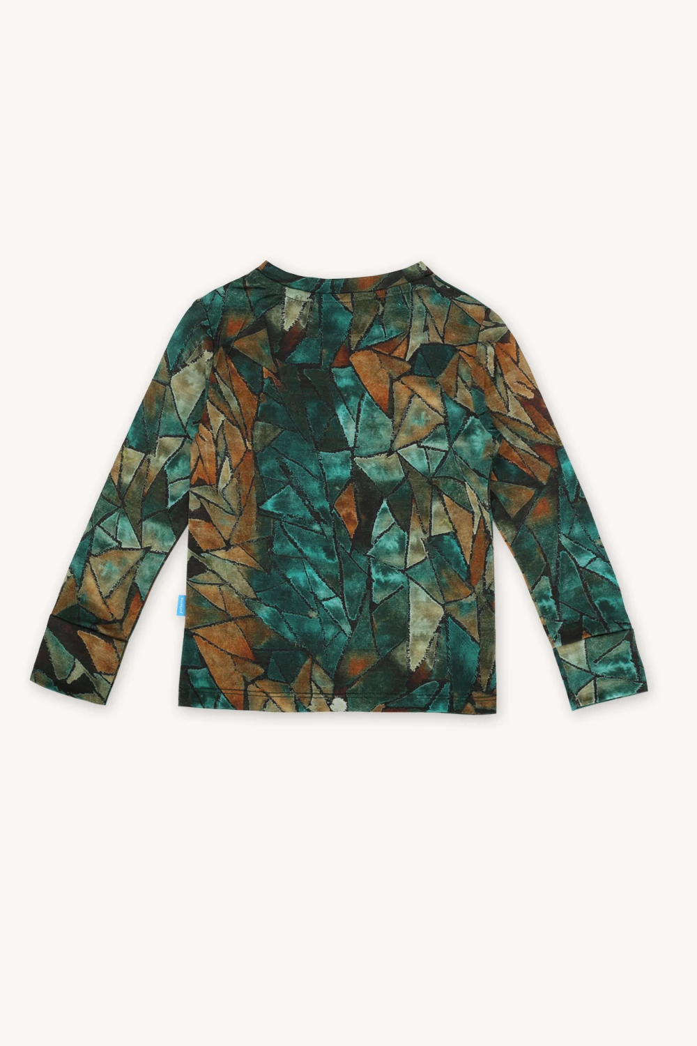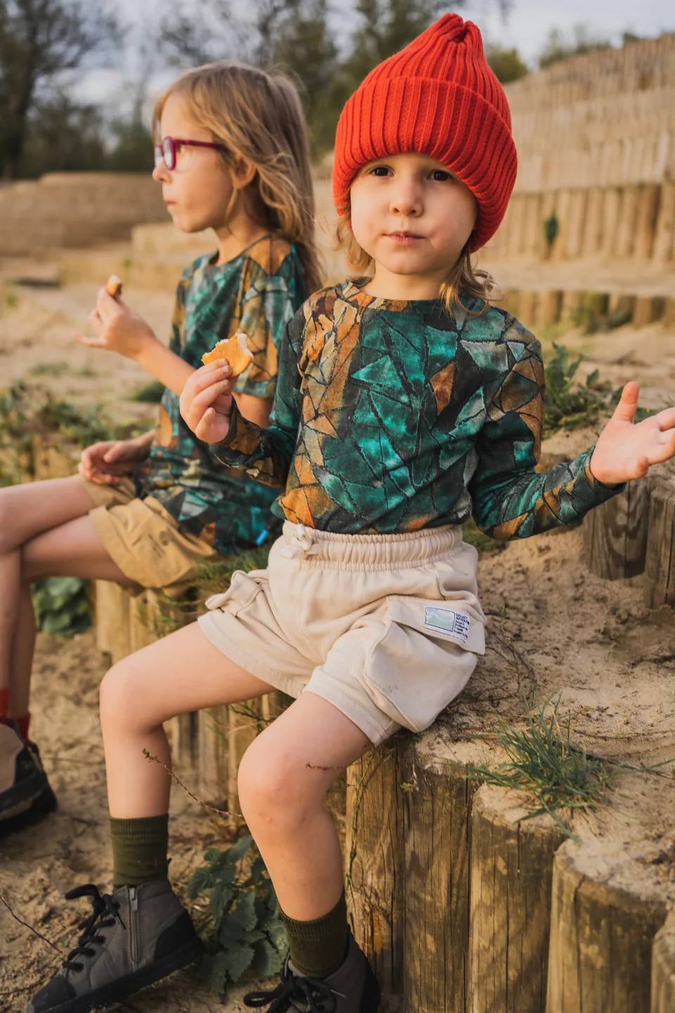 Tenké a pružné dětské merino tričko s dlouhým rukávem ve vzoru green gorpcore je vyrobené z jemného úpletu z 100% merino vlny.