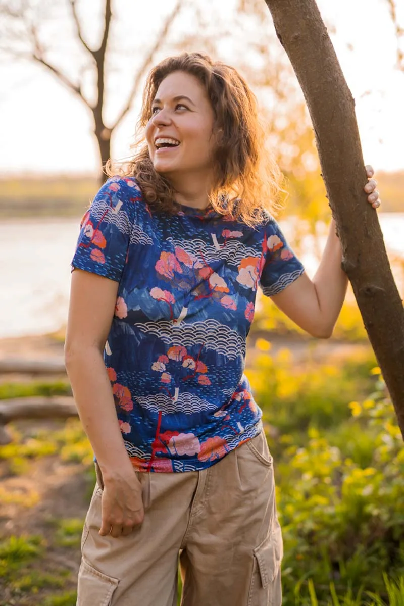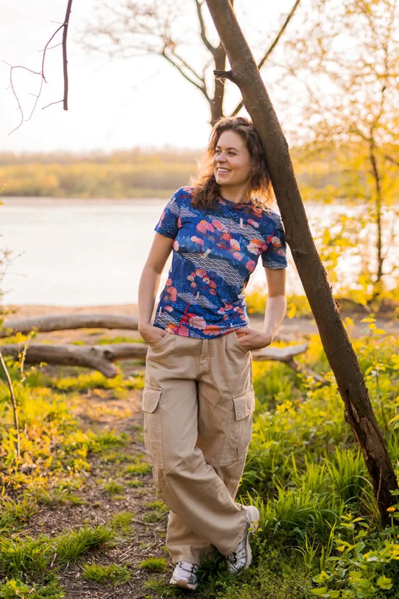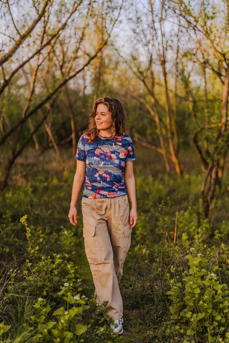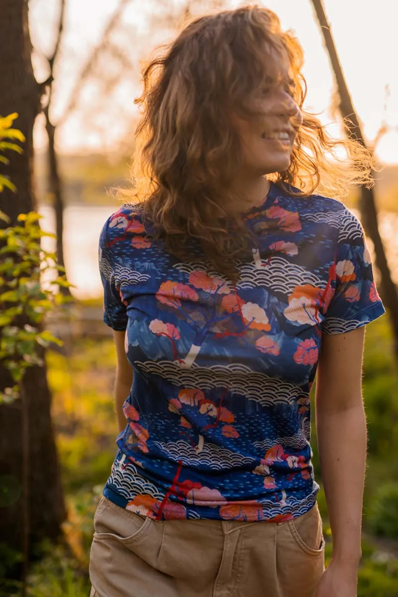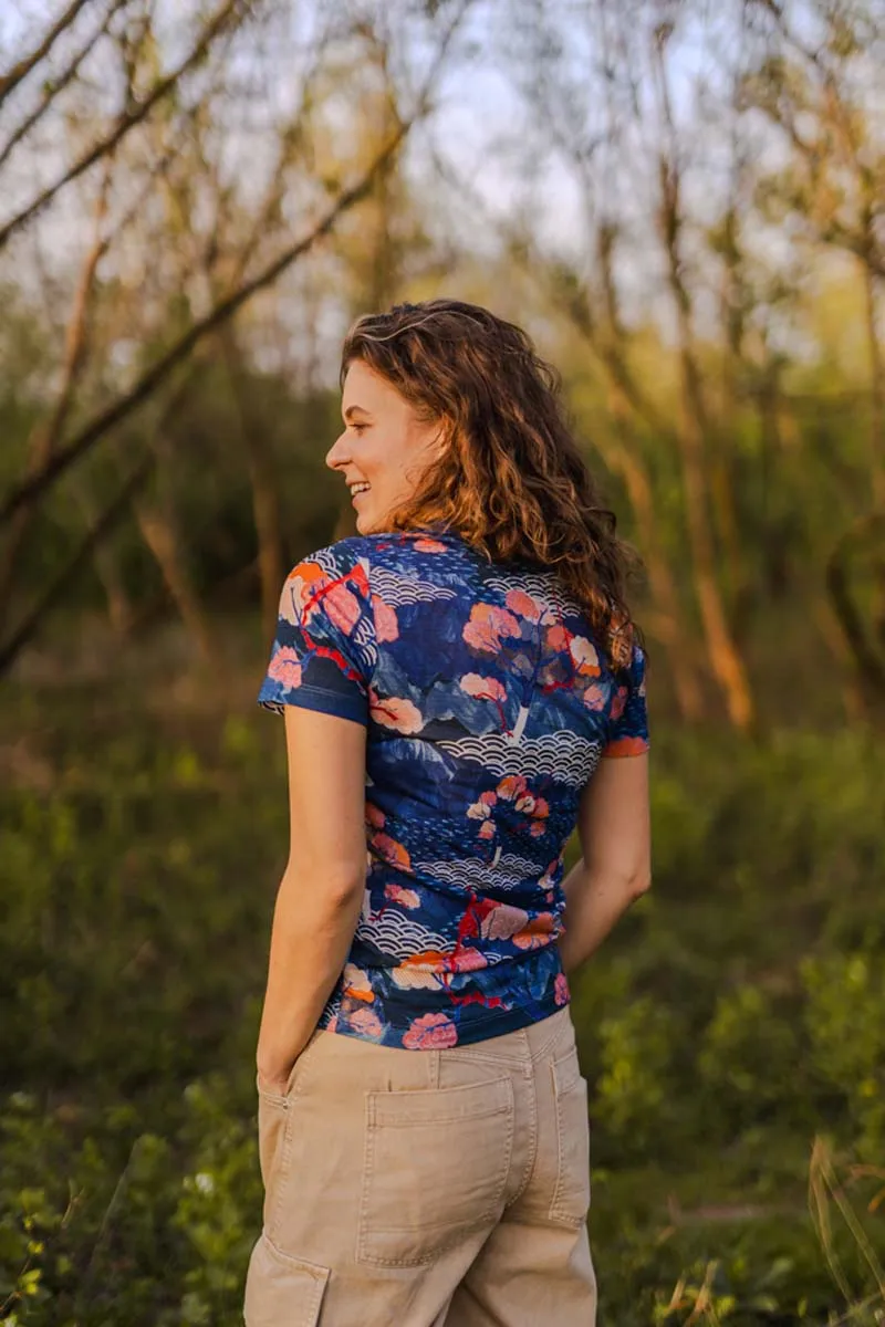 Originální dámské merino tričko ve vzoru tengoku zaujme svým modrým potiskem inspirovaným přírodou. Vyrobené ze 100% merino vlny o gramáži 135 g/m² – lehké, prodyšné a ideální pro aktivní ženy.
