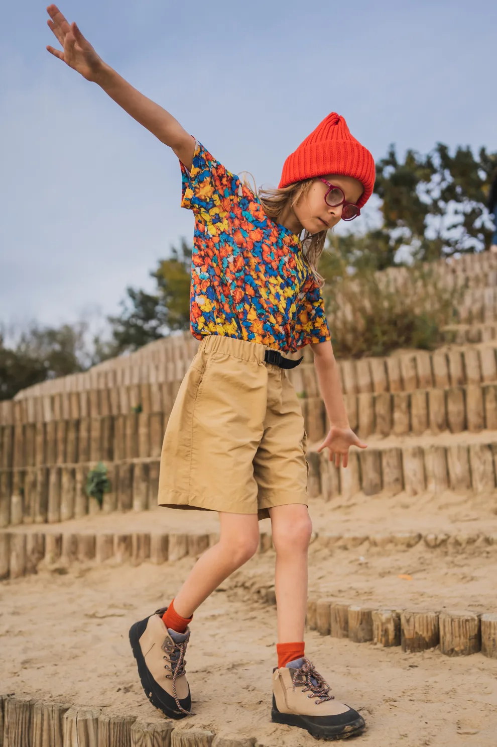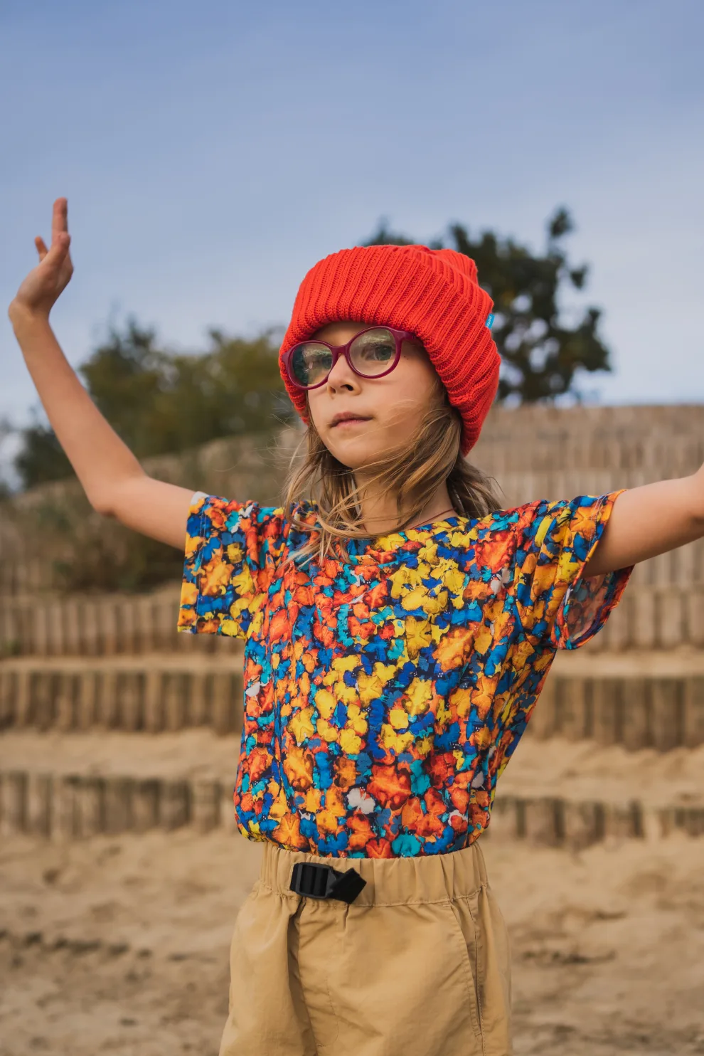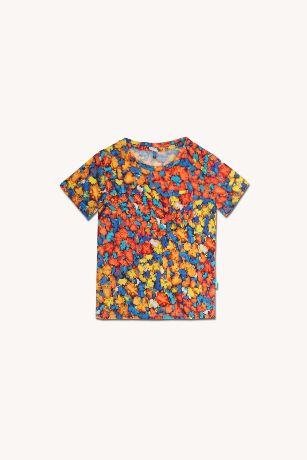 Veselé dětské merino tričko ve vzoru papilio spojuje barvy slunce, oblohy a energie – oranžová, žlutá a modrá vytvářejí originální, ručně malovaný motiv.