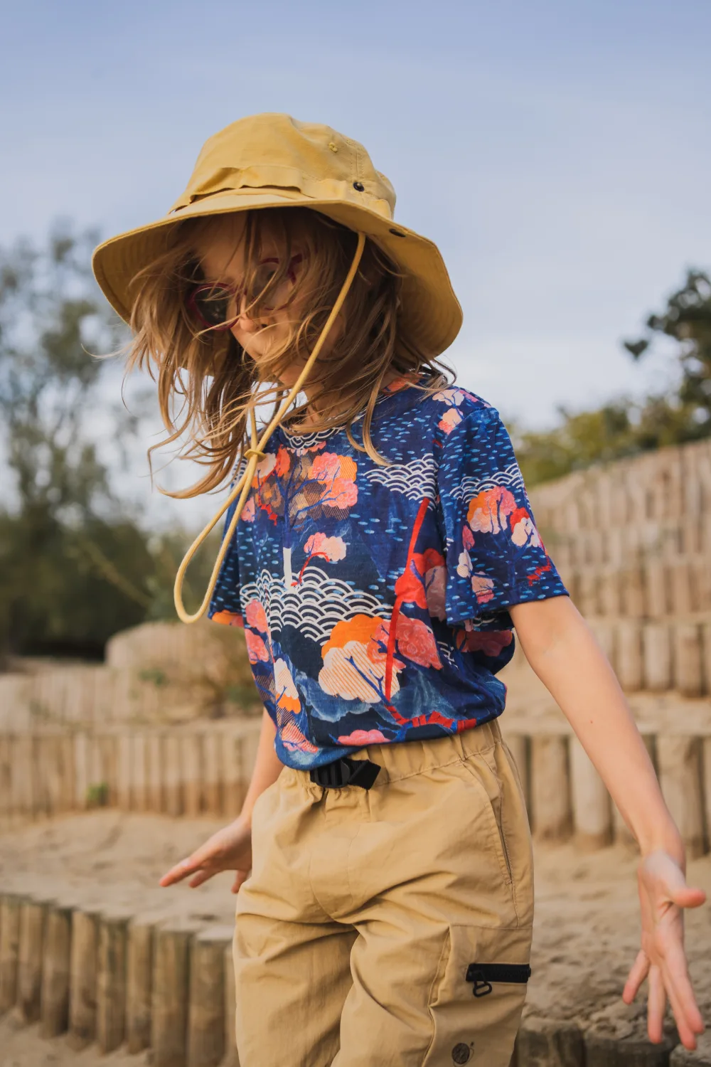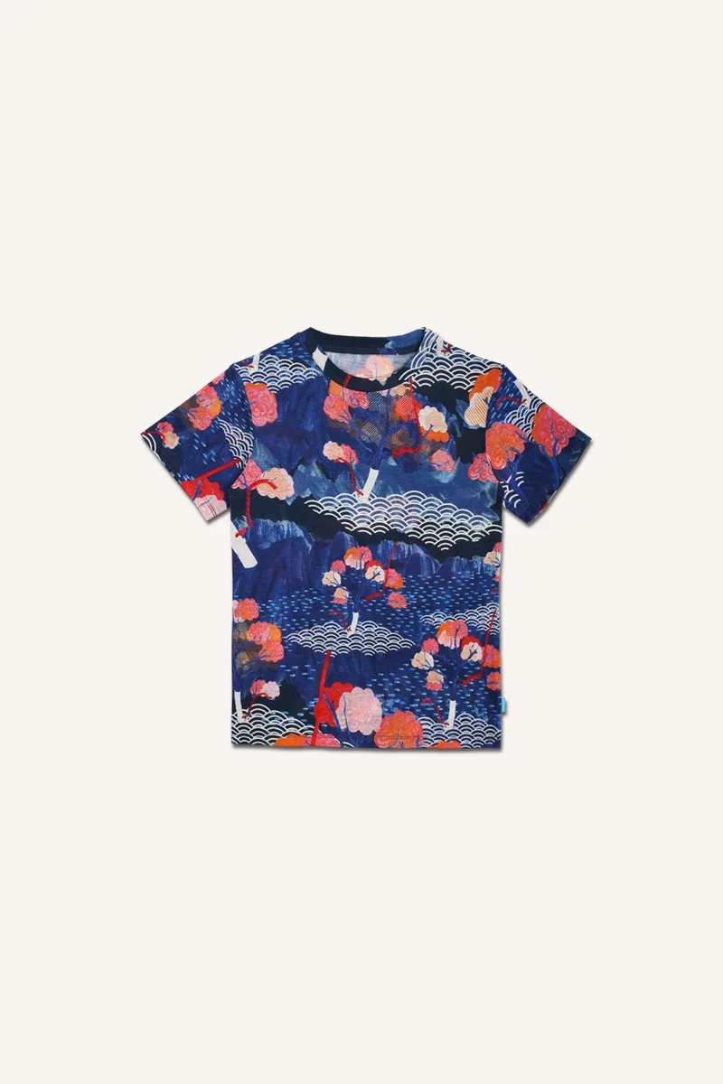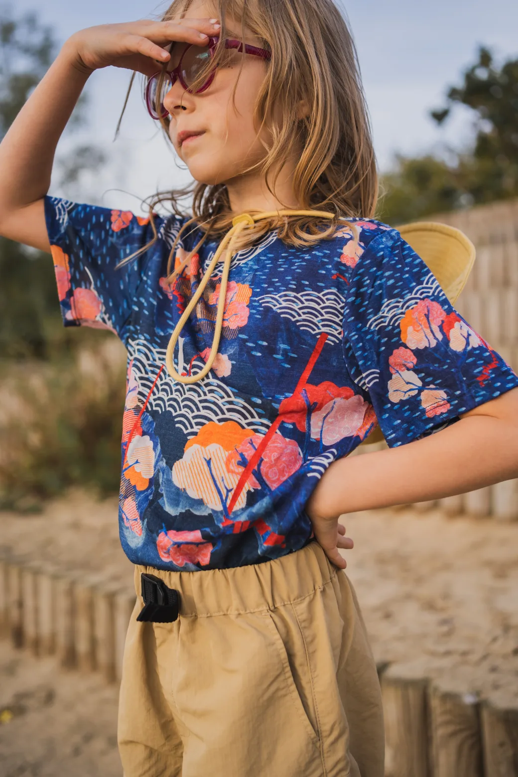 Dětské tričko z jemné merino vlny s krátkými rukávy a vzorem tengoku v modrých tónech. Měkké, prodyšné a příjemné na dotek – ideální pro aktivní děti po celý rok.