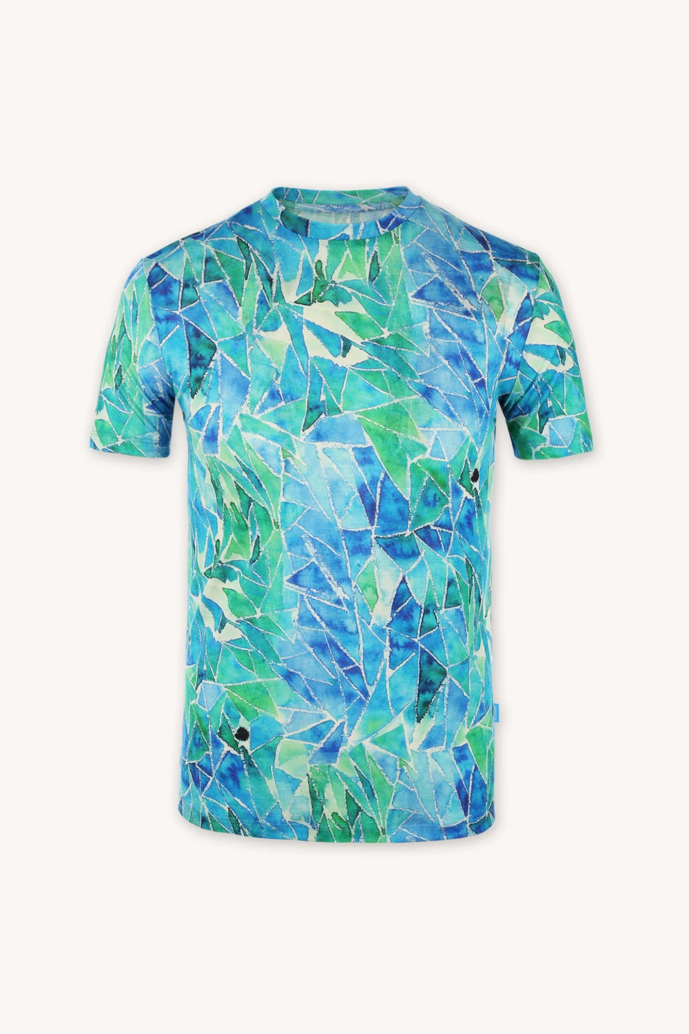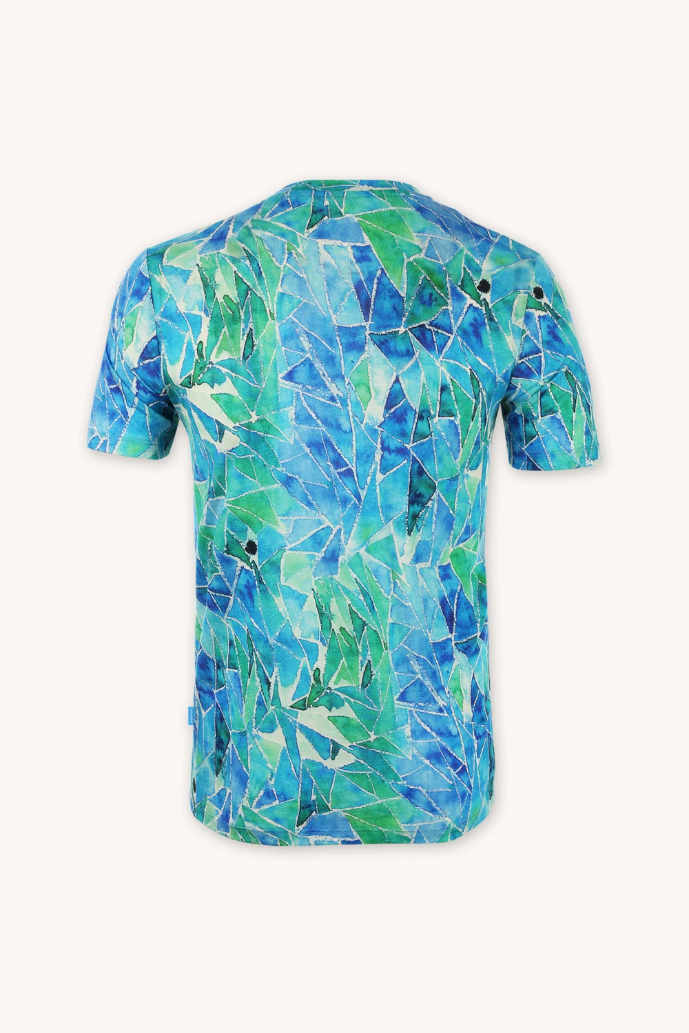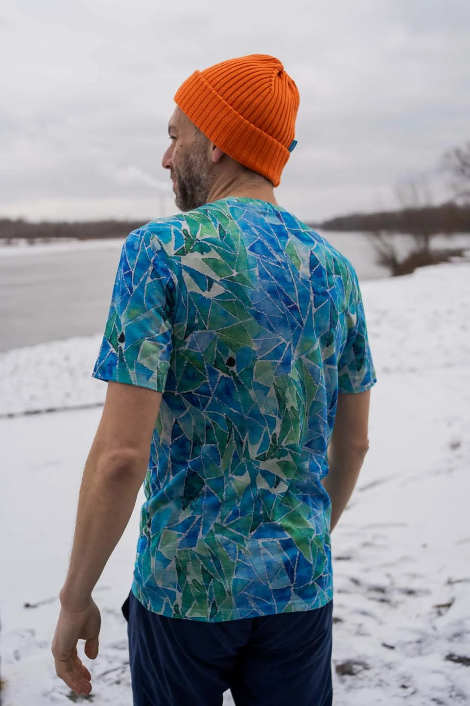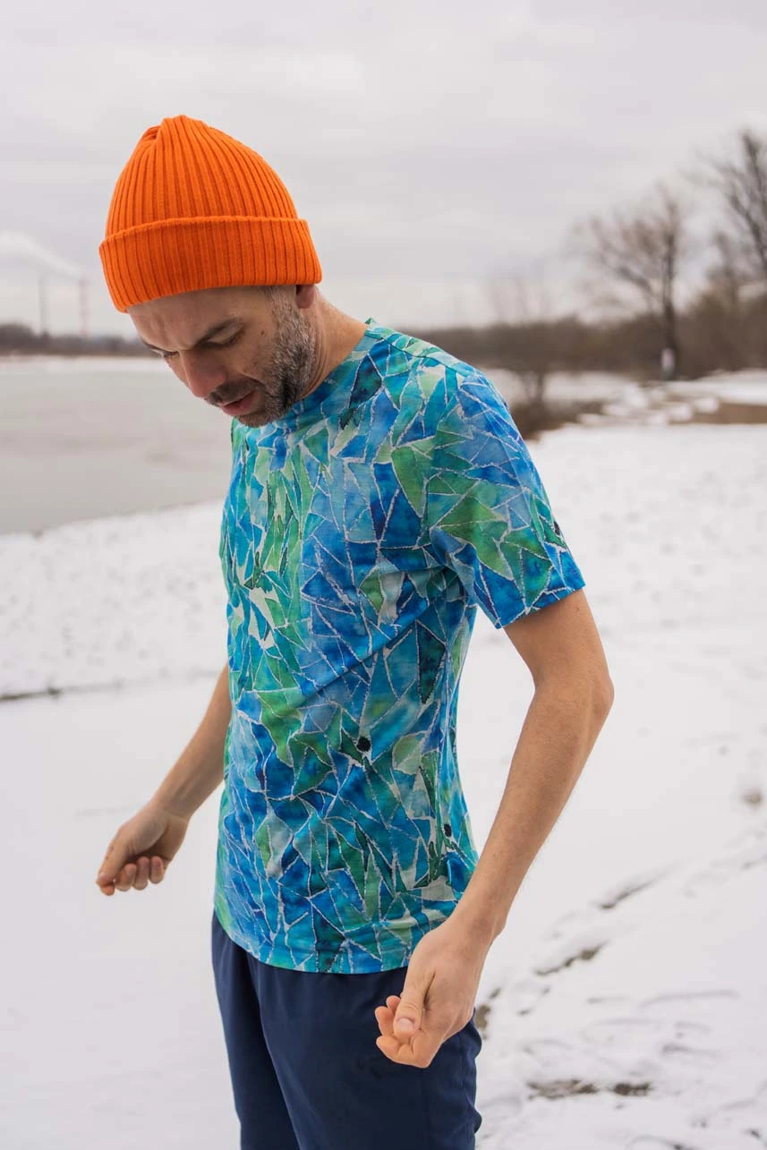 Vzor blue gorpcore vychází z ručně malované ilustrace. Každý kus má jedinečné rozmístění barev, díky čemuž je každé tričko originál.