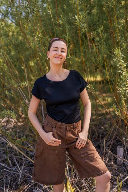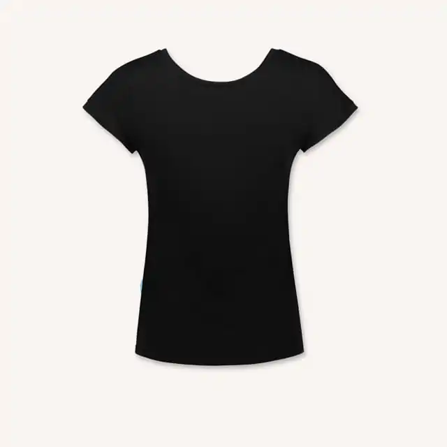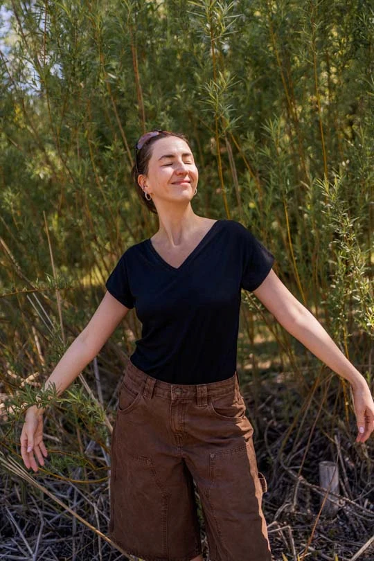 Tričko můžeš nosit s výstřihem do V vpředu nebo vzadu. Výstřih není hluboký, takže podprsenka zůstane skrytá a tričko se přizpůsobí tvému stylu.