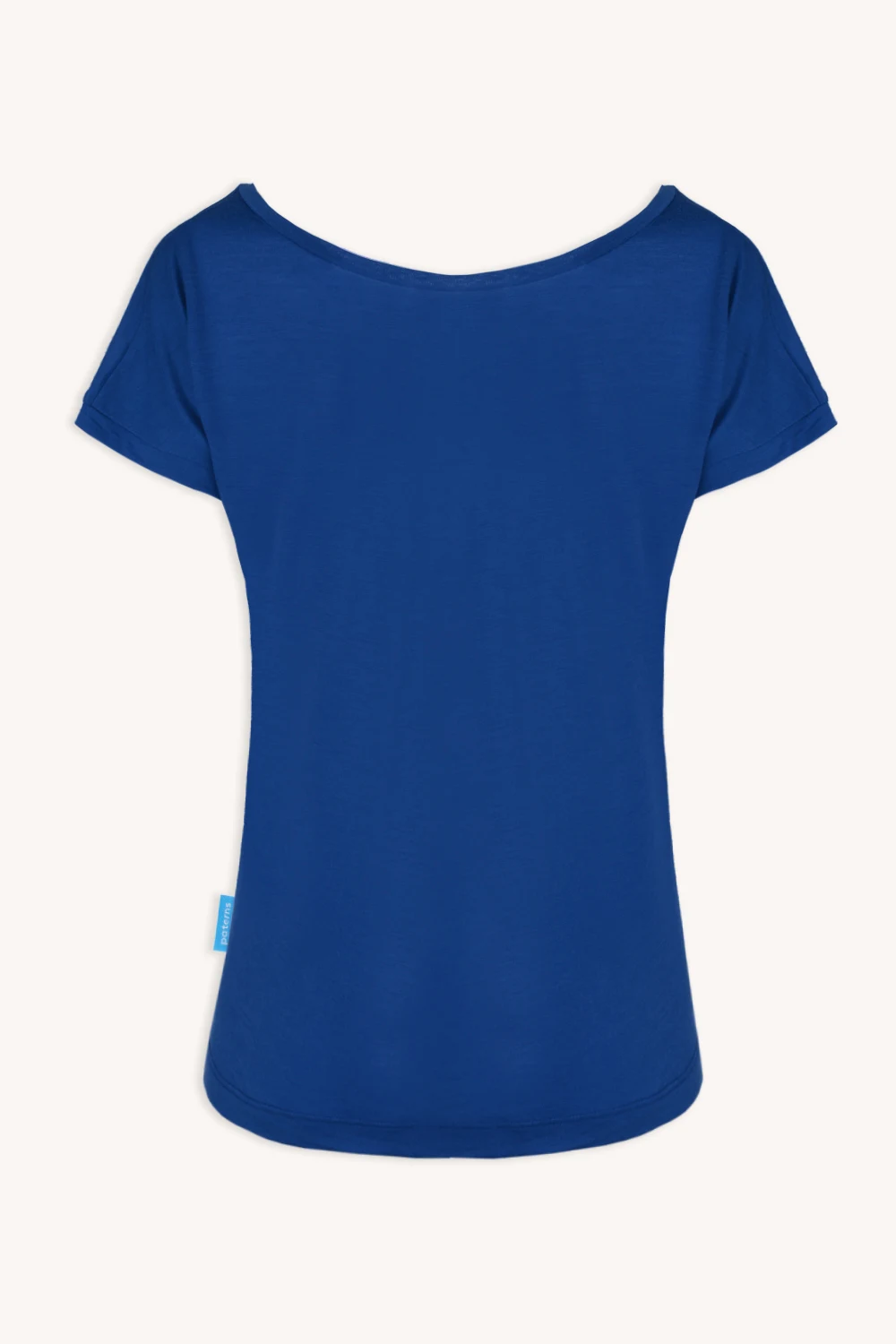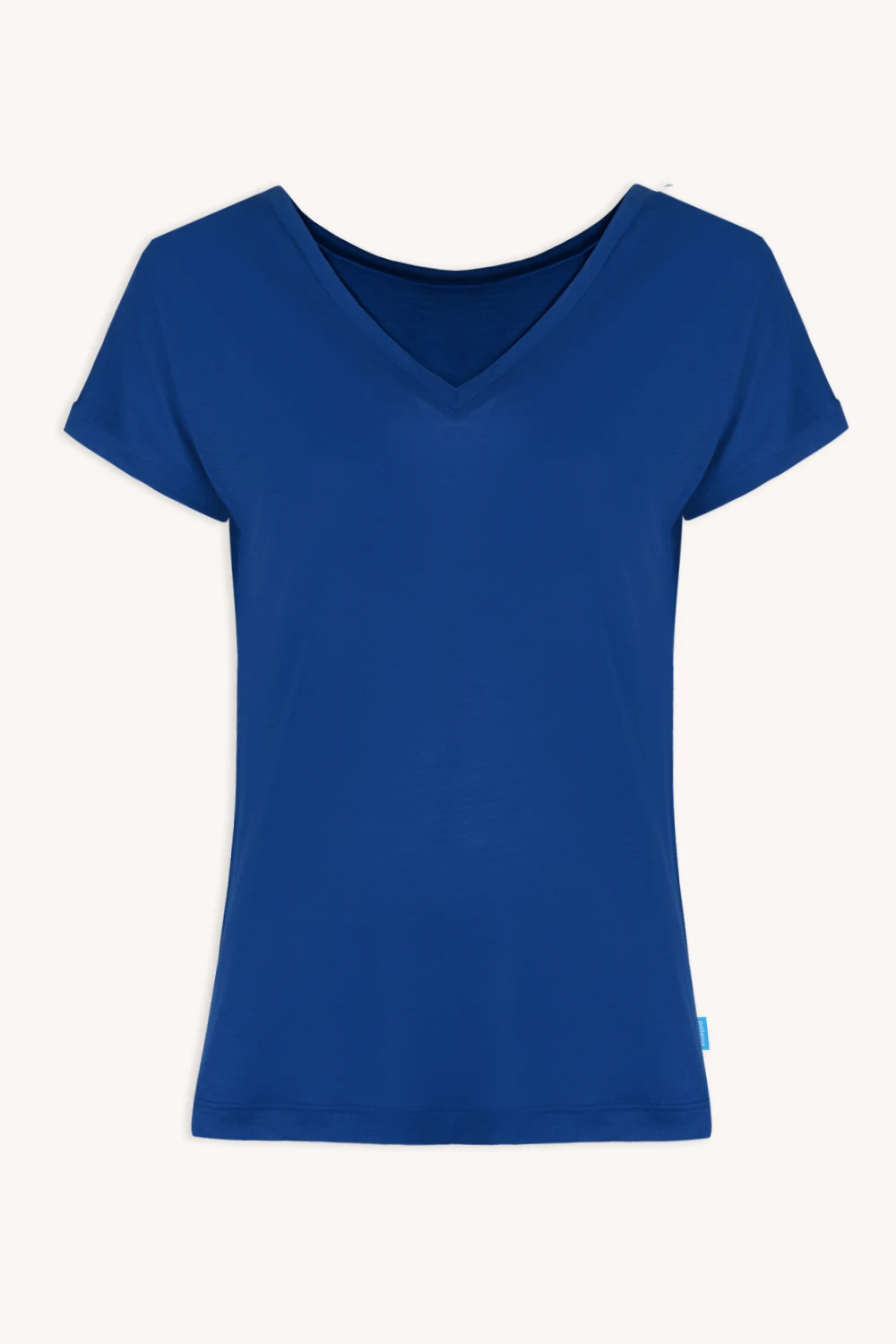 Dámské merino tričko s výstřihem do V ze 100% merino vlny v kobaltové barvě. Lehké, prodyšné a funkční tričko, které využijete jako základní vrstvu i samostatný top na každý den.