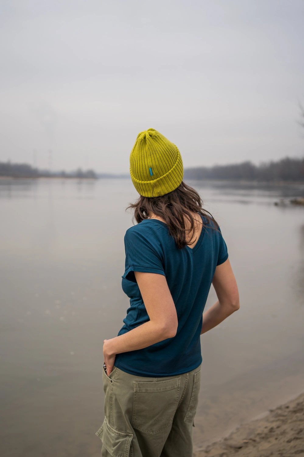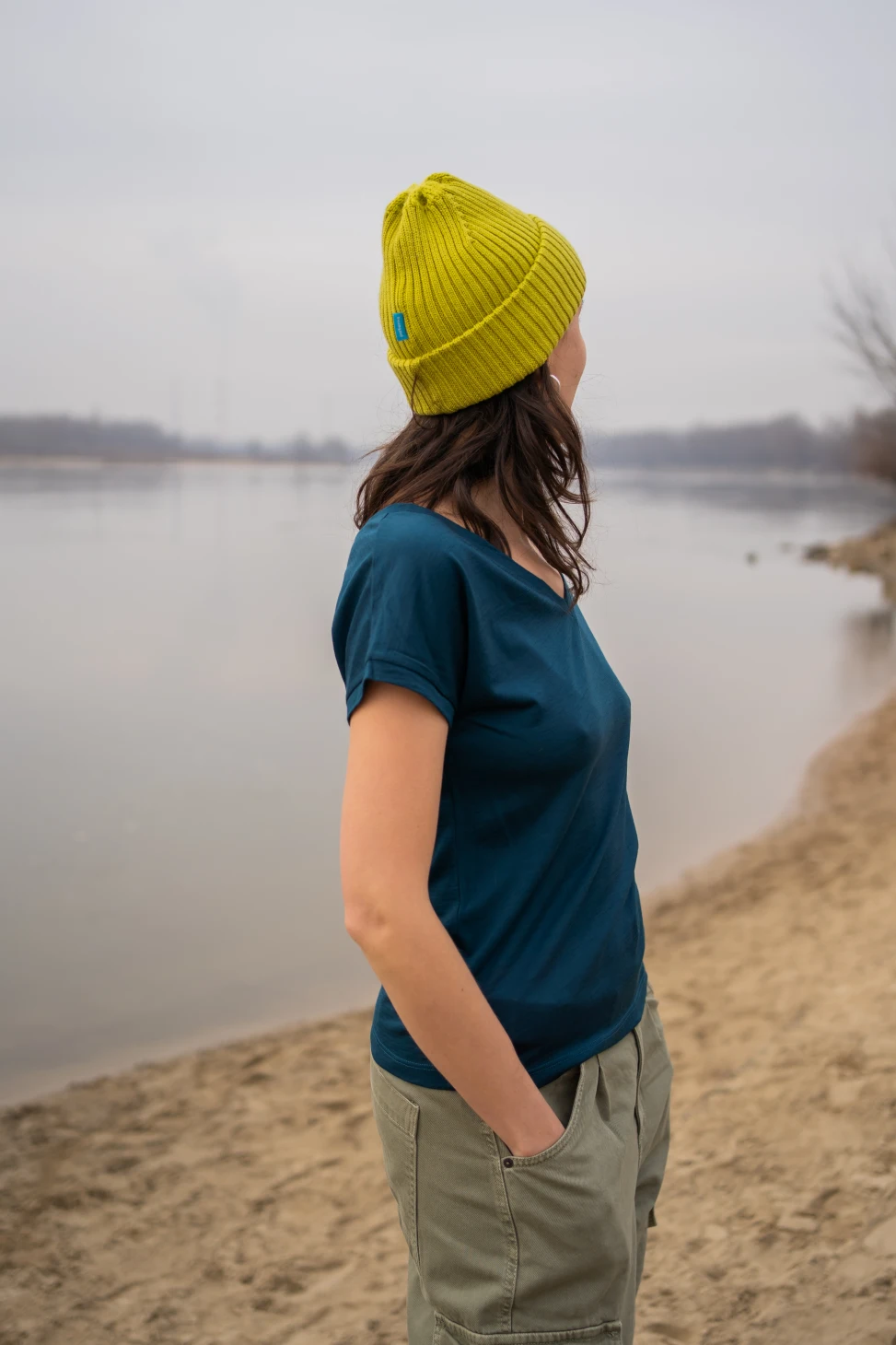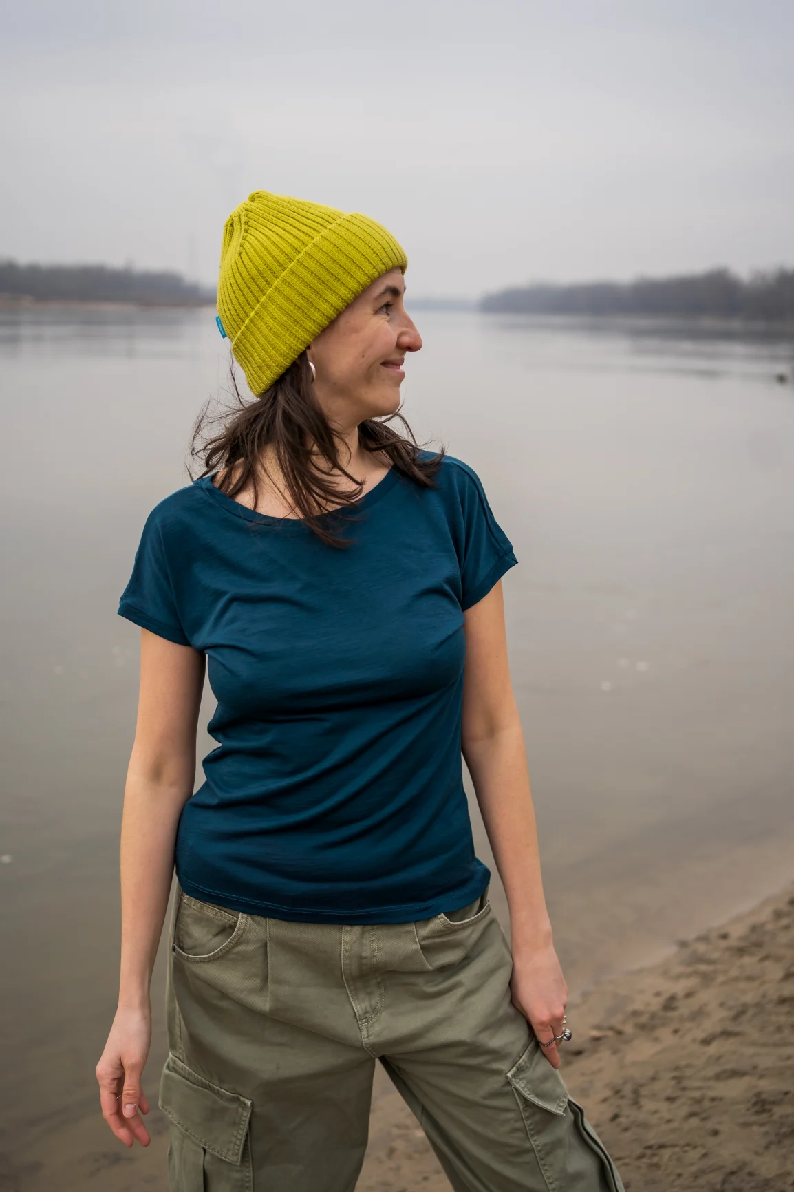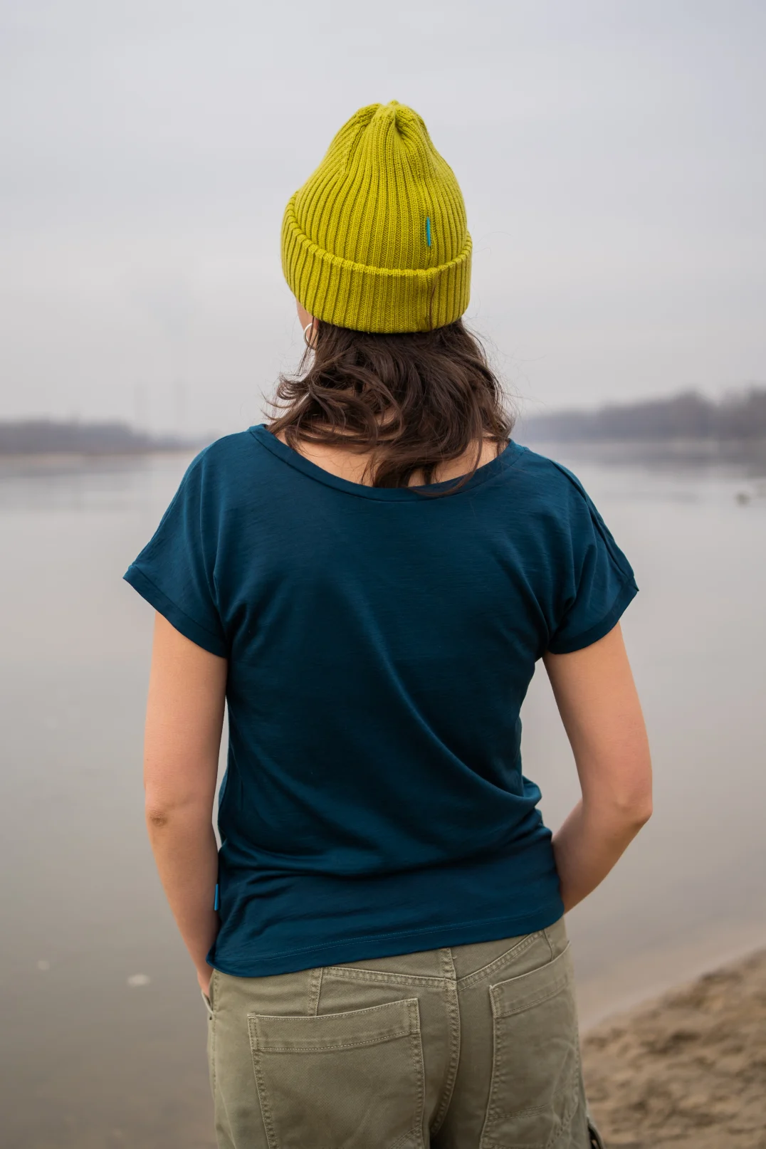 Lehké dámské merino tričko s výstřihem do V v petrolejové barvě je funkční, prodyšné a pohodlné.