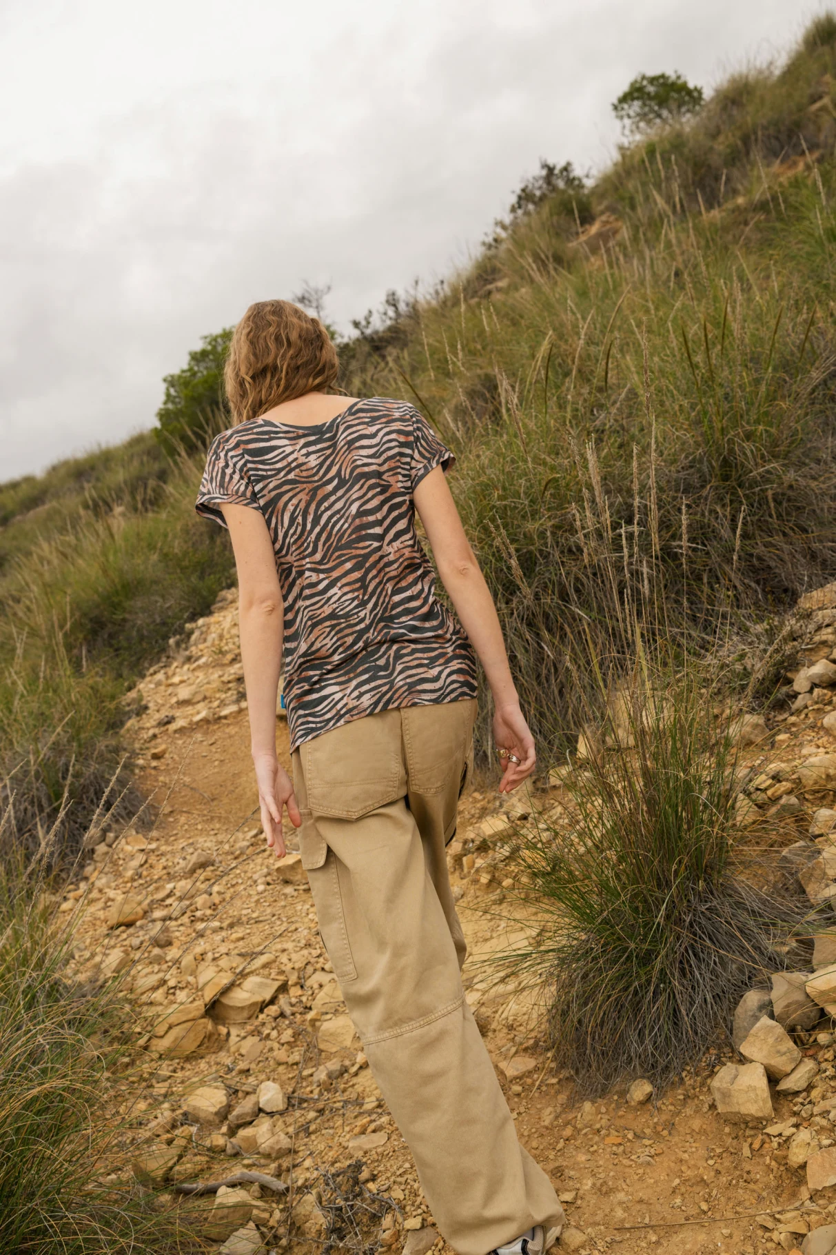 Dámské merino tričko zebra se zvířecím vzorem s výstřihem do V. Vyrobené ze 100% jemné a lehké merino vlny.
