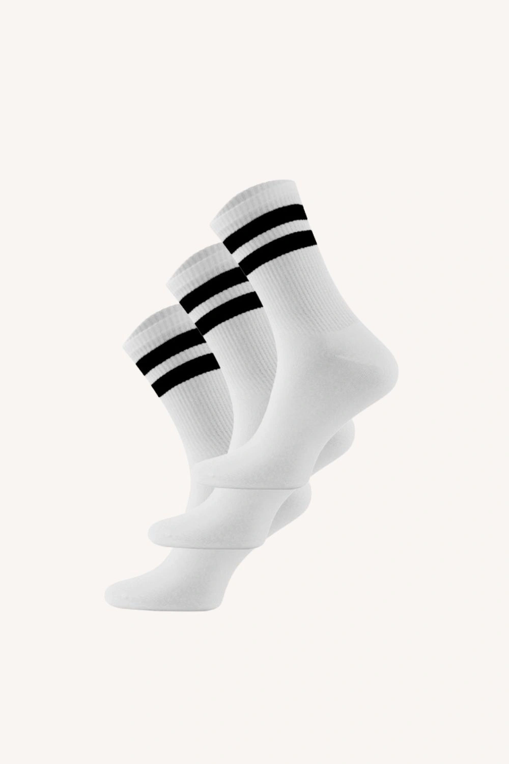 Klasická bílá barva a dva proužky na lemu dodávají ponožkám čistý, sportovní vzhled.
